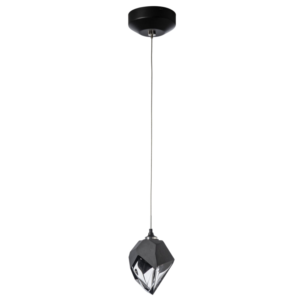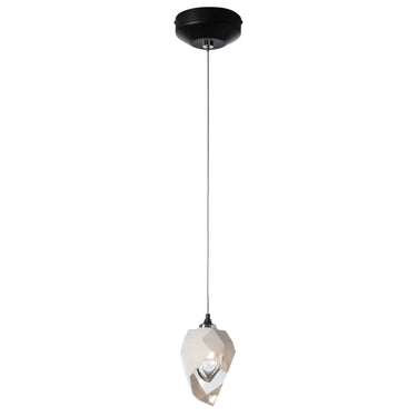 The Chrysalis 1-Light Large Crystal Pendant is a low-voltage fixture that features a single, handcrafted faceted small glass crystal suspended from a small round canopy. A thick, clear layer of glass is encased in an outer cocoon of hand-blown, colored glass (matte black or white). Hand-polished like a gemstone, the lower portion of the outer layer of glass is removed to reveal the inner crystal clear layer below and is lit from within.