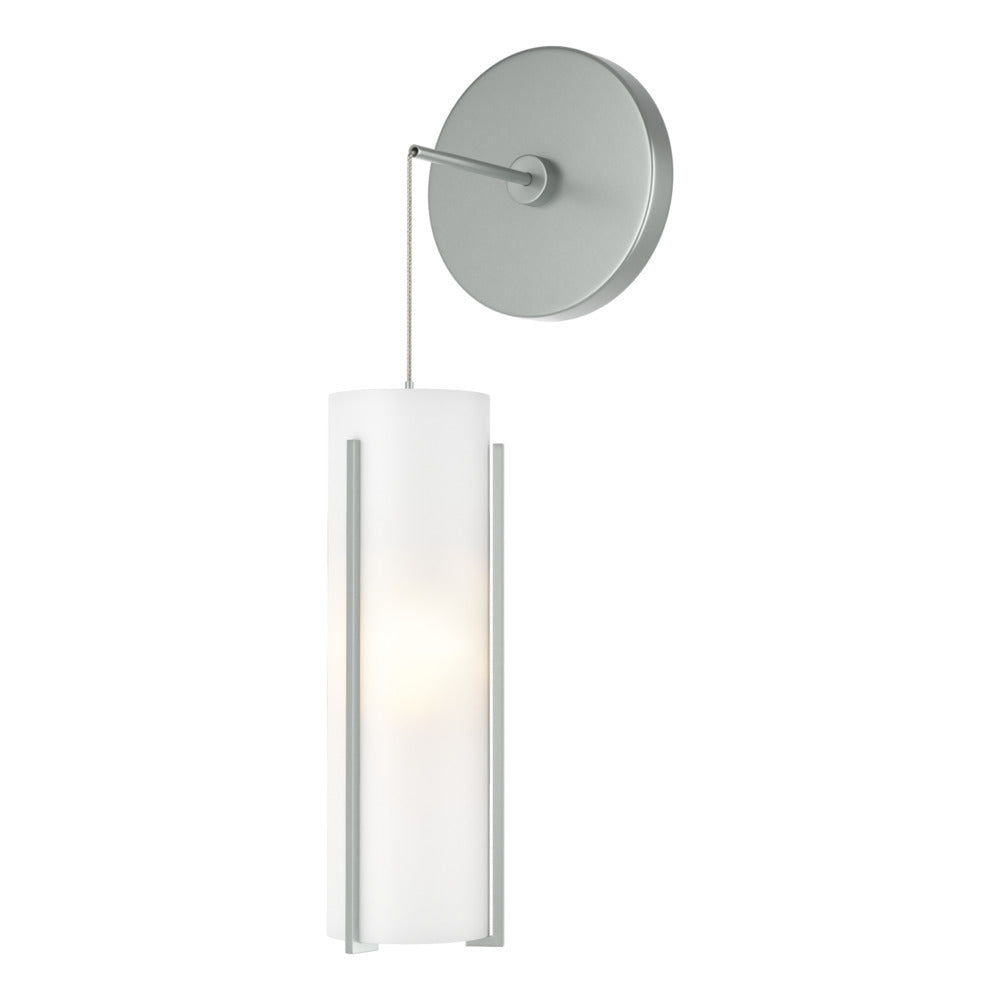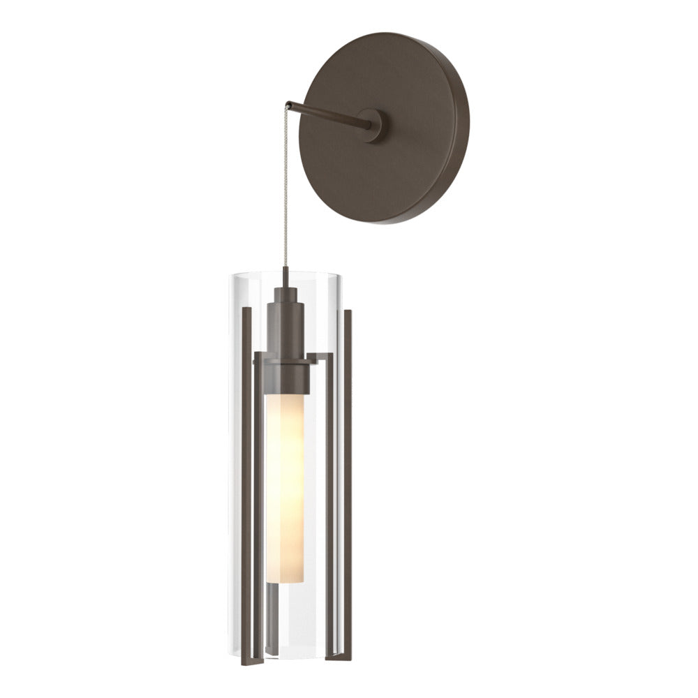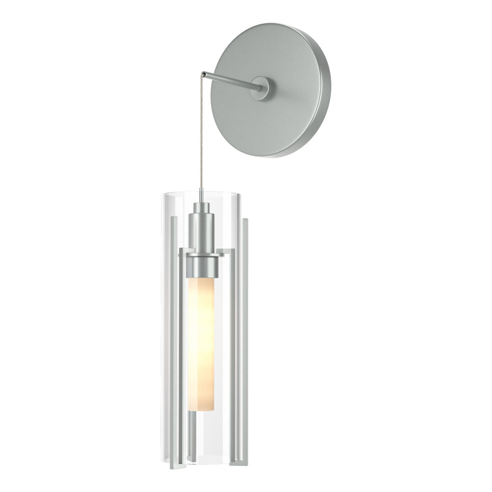 The Exos Collection pieces feature steel rods handcrafted to vertically support each shade. Glass double cylinders, with a frosted inner and a choice of clear or frosted outer glass shade offer a different feel and style for any space. You can set your own desired sconce drop height for unique applications, including vanity or beside, among others.