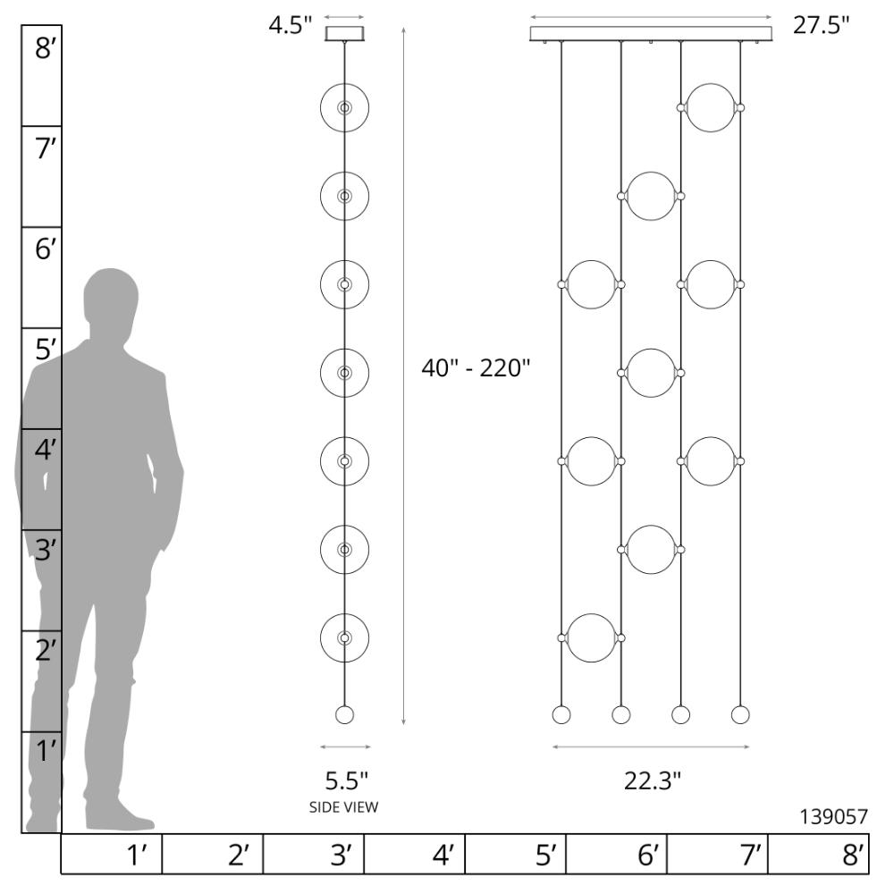 Cable hung dedicated LED pendant with nine glass globes on a single canopy. Each glass globe and LED array may be individually height adjusted from 20" to 220". Optional floor mounting plate (#905210) sold separately. Additional LED arrays may be purchased individually if desired. See Installation Instructions for more details.- Sloped Ceiling: Adaptable one way to 45 degrees