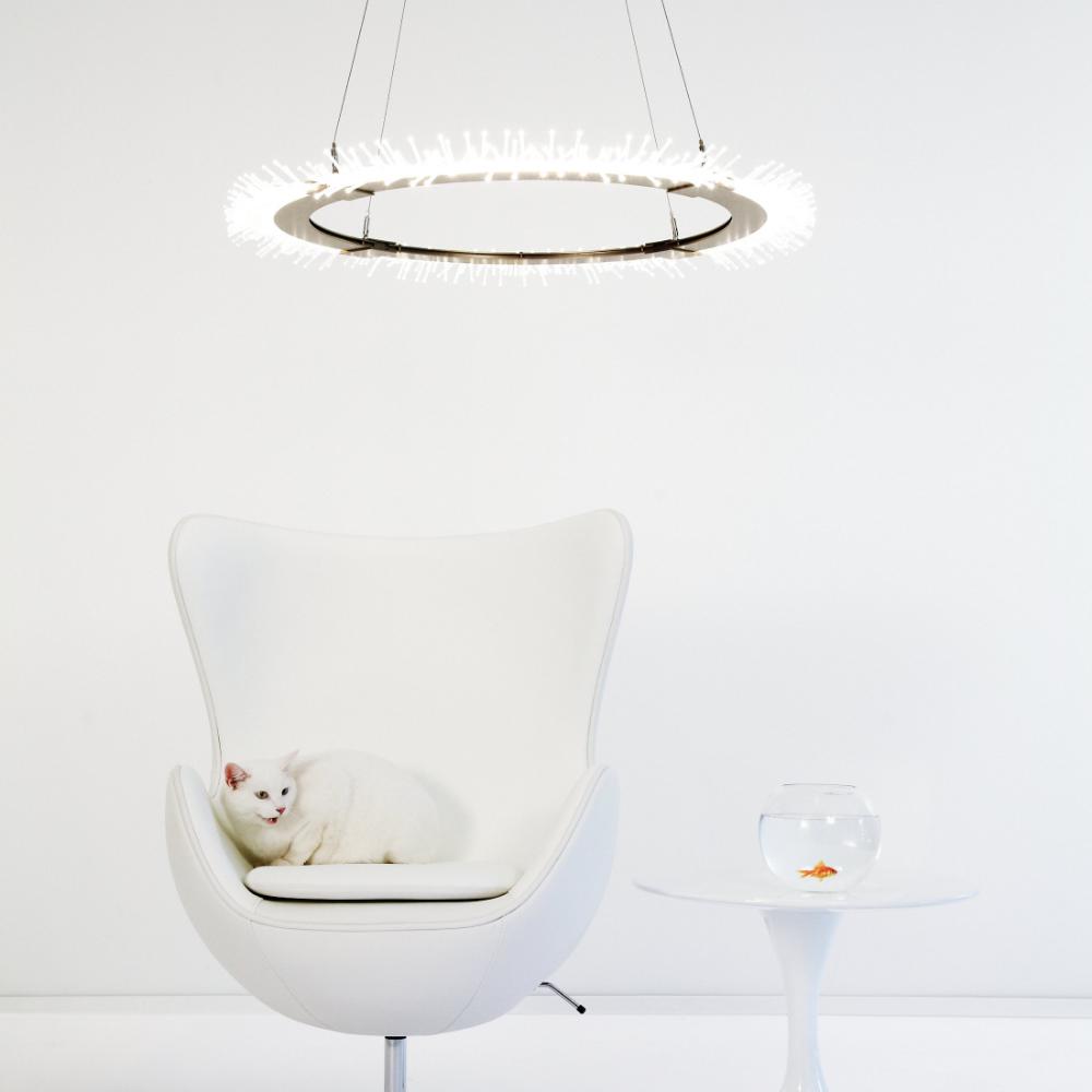 A circular LED light guide is suspended from four cables and feeds light to the Anemone's bristles. The bristles spread light to your room as dim or bright as you'd like.