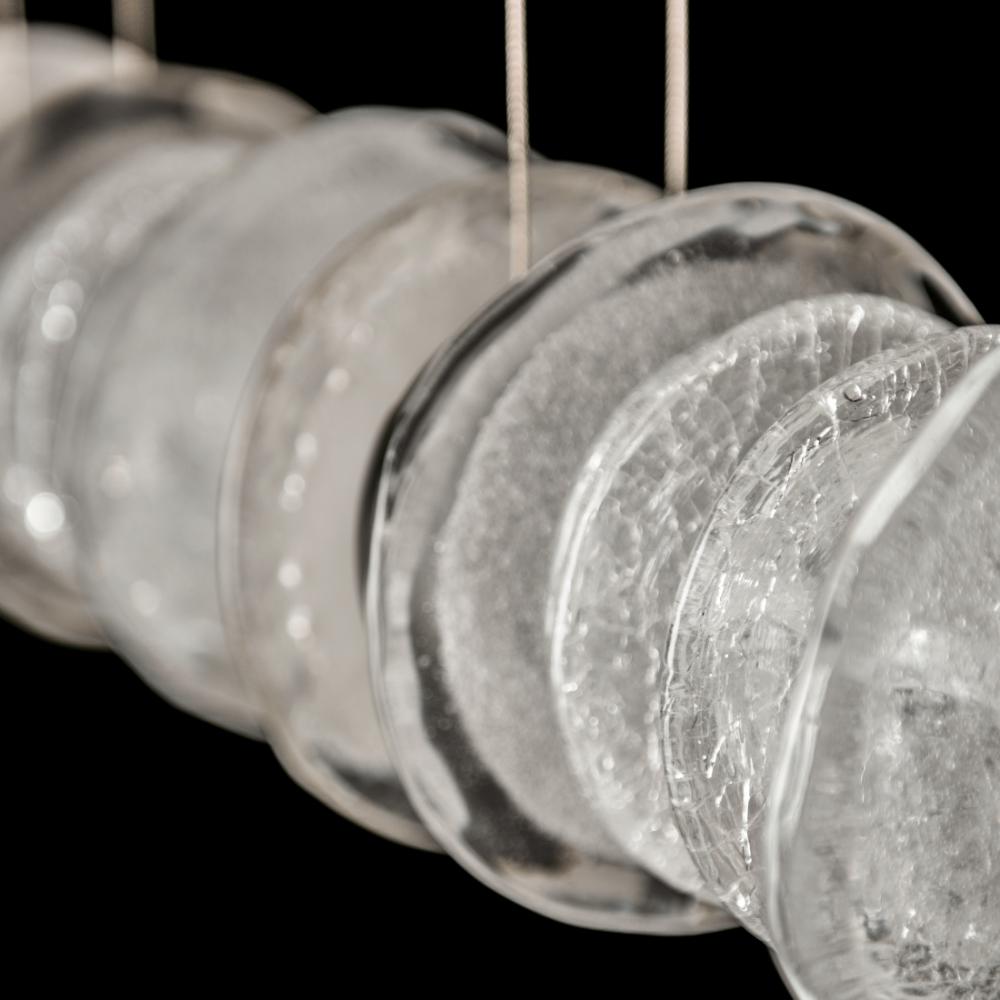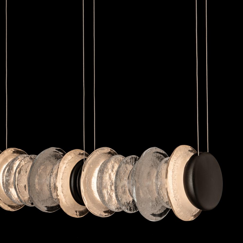 An addition to the Cairn Collection, this pendant tips the vertical glass "stone" stacks to a horizontal in this wonderful linear version. Round, textured clear and bubble glass of varying diameters are positioned side by side. Each of five "stacks" is bookended by metal, stone-shaped LED modules to great visual effect. Cable-hung, the Cairn Linear LED Pendant boasts a 4.7ft expanse, creating a stunning piece that is at home over a kitchen island, bar or reception counter, a dining table, a billiards table, and more.