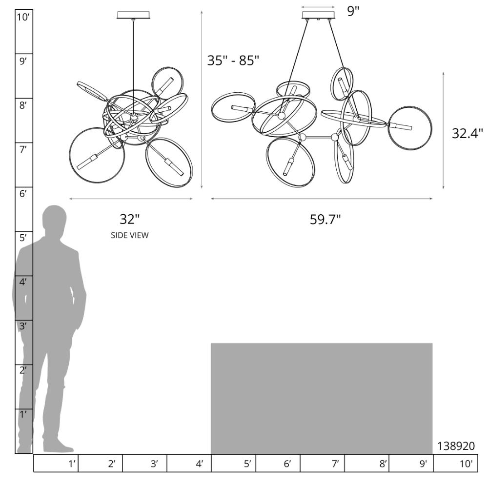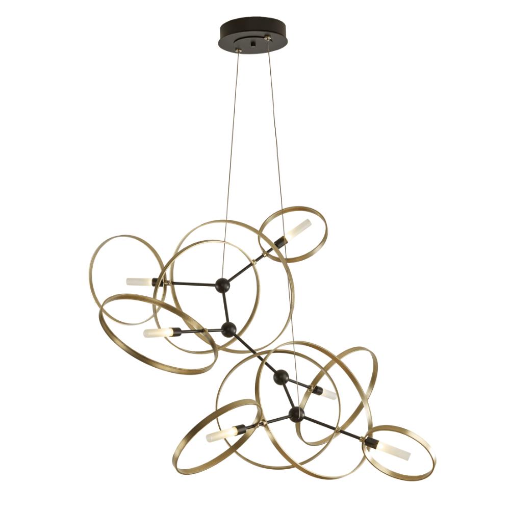 With adjustable rings hung from two steel cables, the Celesse constellation can be personalized. Choice of Soft Gold or Vintage Platinum finish for the aluminum rings and our range of standard steel finishes for the core.