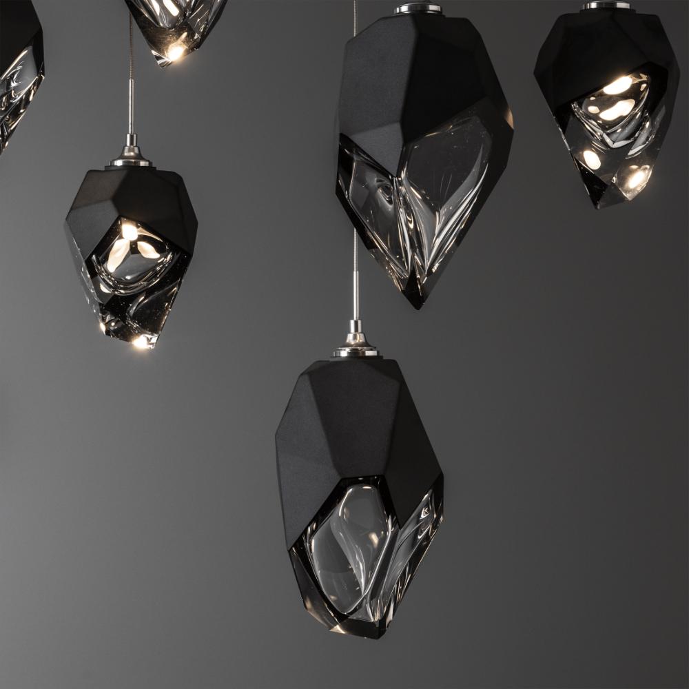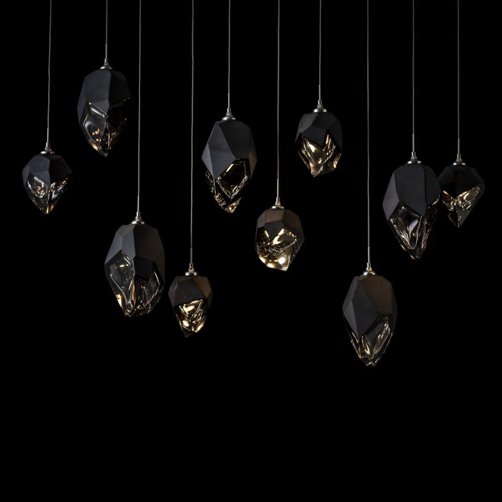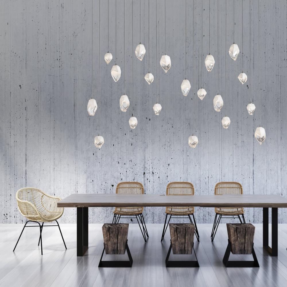 Five Large Chrysalis pendants and five Small Chrysalis pendants hung from a rectangular canopy. Each pendant may be individually adjusted for a custom look. Note, the upper canopy can will always be black while the canopy faceplate will match the selected finish.- Sloped Ceiling: Adaptable one way to 45 degrees