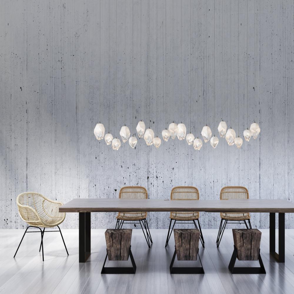 Five Large Chrysalis pendants and five Small Chrysalis pendants hung from a rectangular canopy. Each pendant may be individually adjusted for a custom look. Note, the upper canopy can will always be black while the canopy faceplate will match the selected finish.