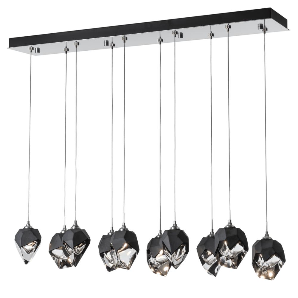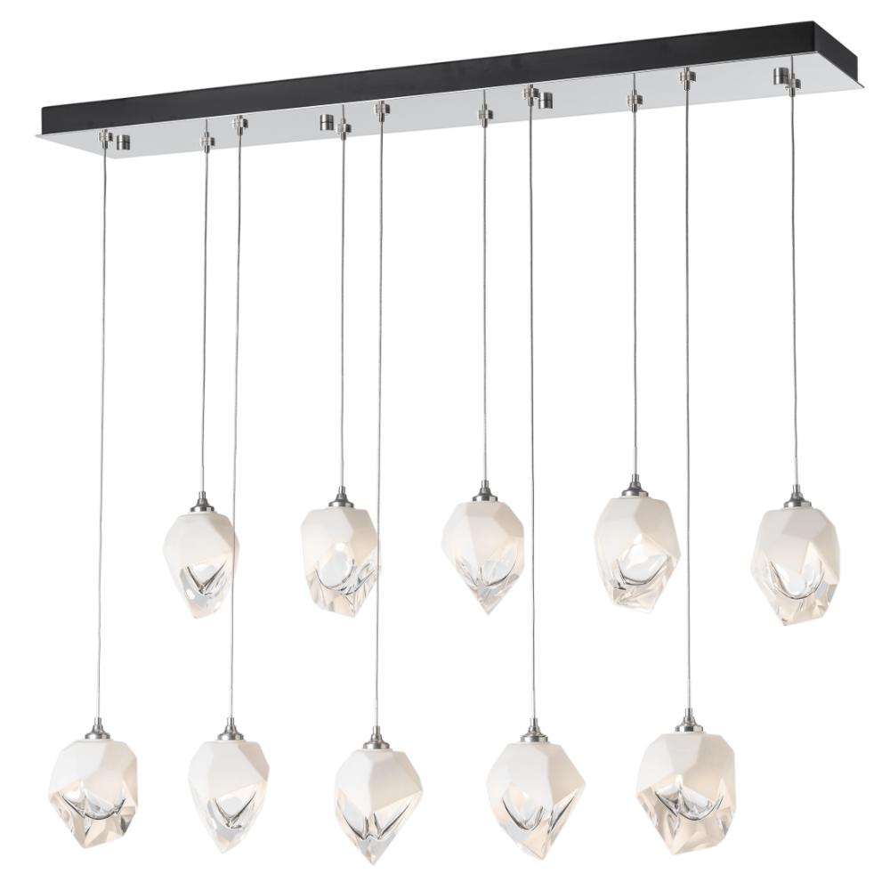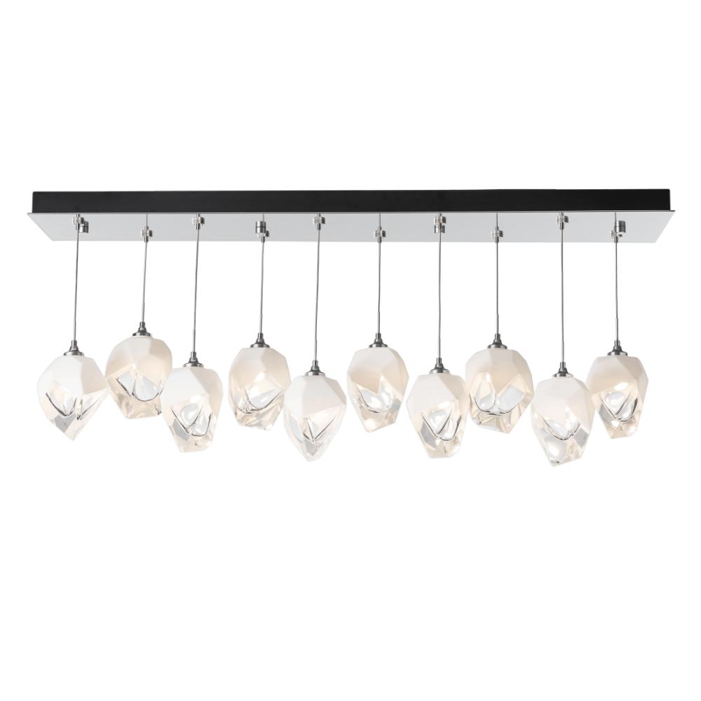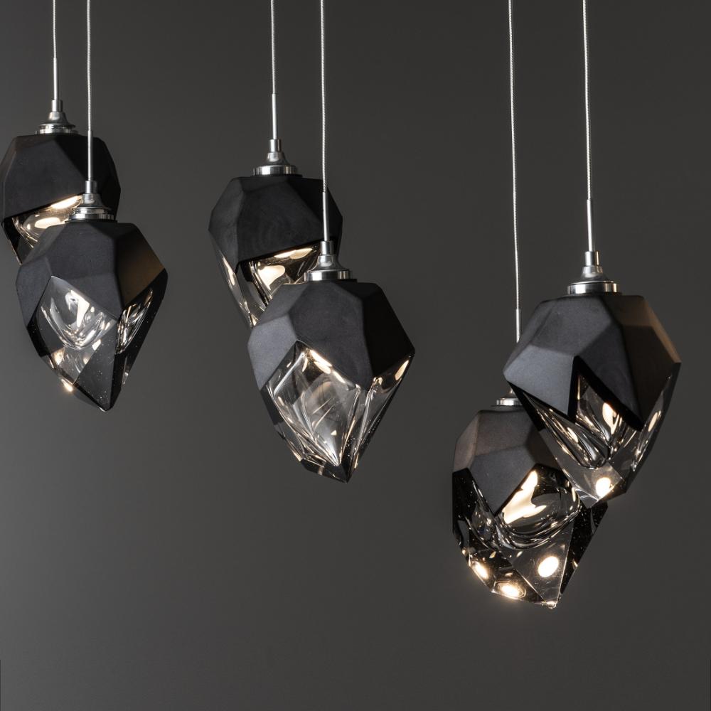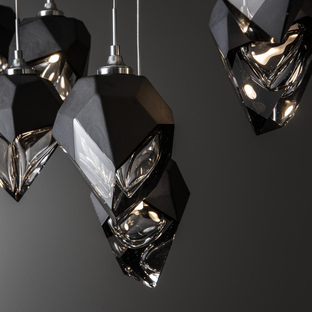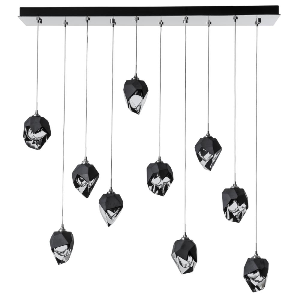 The Chrysalis 10-Light Small Crystal Pendant is a multi-port fixture that features ten small, handcrafted faceted glass crystals suspended from a rectangular canopy. A thick, clear layer of glass is encased in an outer cocoon of hand-blown, colored glass (matte black or white; all 10 are same color). Hand-polished like a gemstone, the lower portion of the outer layer of glass is removed to reveal the inner crystal clear layer below. Each crystal is lit from within.