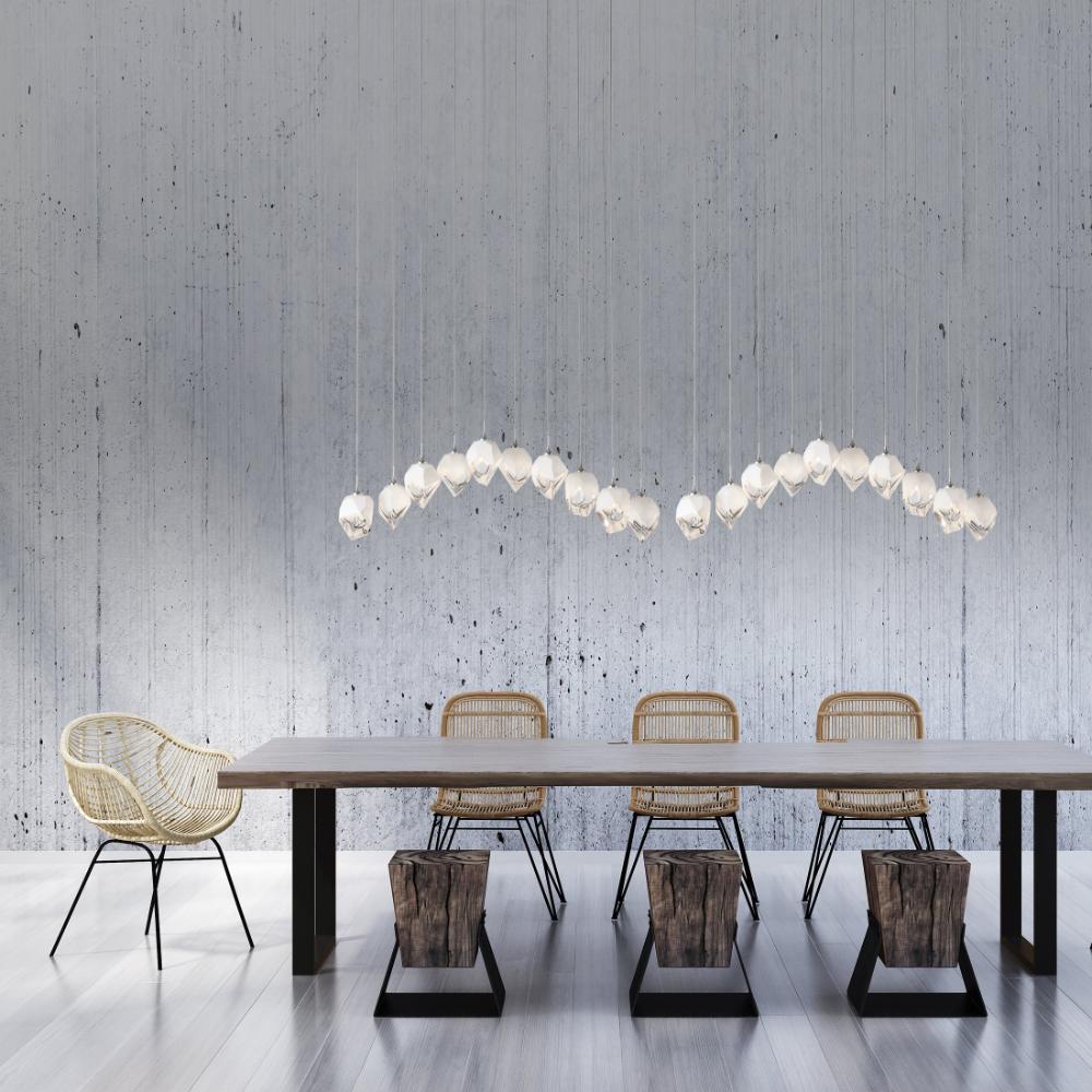 Ten Small Chrysalis pendants hung from a rectangular canopy. Each pendant may be individually adjusted for a custom look. Note, the upper canopy can will always be black while the canopy faceplate will match the selected finish.- Sloped Ceiling: Adaptable one way to 45 degrees