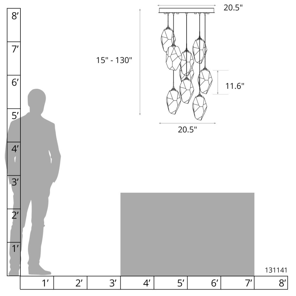 Nine Large Chrysalis pendants hung from a circular canopy. Each pendant may be individually adjusted for a custom look. Note, the upper canopy can will always be black while the canopy faceplate will match the selected finish.- Sloped Ceiling: Adaptable one way to 45 degrees