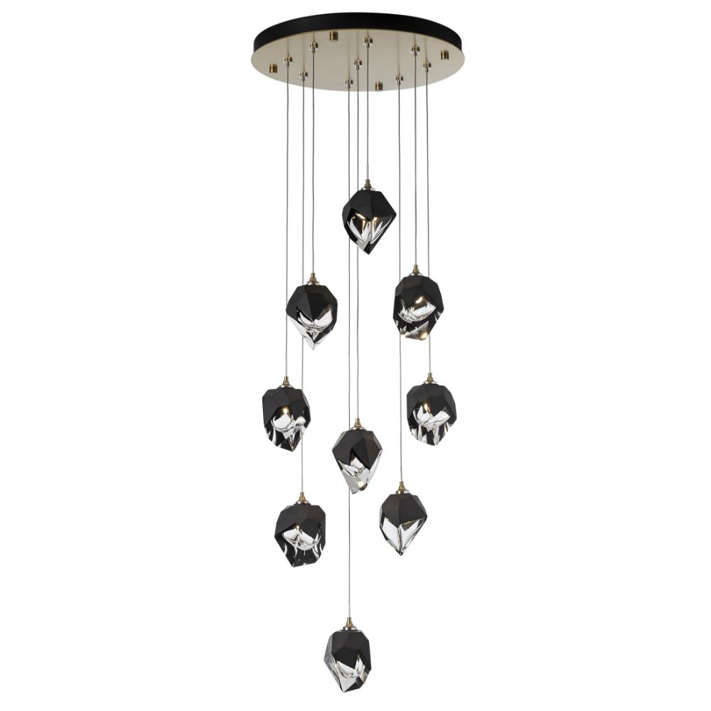 The Chrysalis 9-Light Small Crystal Pendant is the perfect focal piece for a stairwell or other central or corner space where cascading crystals lit from within create a waterfall of light when pendants are staggered. Highly-customizable, each individual crystal light is suspended via low-voltage cable from its round canopy. A thick, clear layer of glass is encased in an outer cocoon of hand-blown, colored glass (matte black or white; all 9 are same color). The lower portion of the outer layer of glass is removed by hand-polishing it, revealing the inner clear layer below.