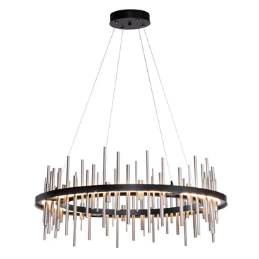 The Circular Cityscape Pendant is a stunning addition to the Cityscape collection of fixtures by Hubbardton Forge. Evoking the imagery of skyscraper silhouettes reflecting upon the waterfront, polished aluminum rods are washed in up-and-down light as they pass through a large circular LED light guide to "reflect" elegantly on the other side. With a choice of accents, this large pendant offers an amazing "city view" no matter where you live.
