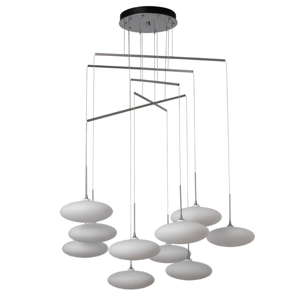 Beautiful white tortoise shell-like glass is shaped in a squashed sphere in this unexpected design resembling a cluster of clouds. Each piece of glass is cable-hung via a mobile created with delicate metal tubes allowing for a highly-adjustable design. The canopy is minimized while the breadth is expanded in an artful display of light.