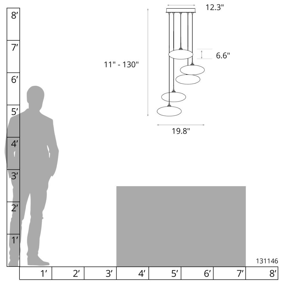Multi-light pendant with five glass shade pendants and finish options. Each pendant can be independently height adjusted. Choose a finish for the fixture and the canopy faceplate. The upper canopy can will always be black.