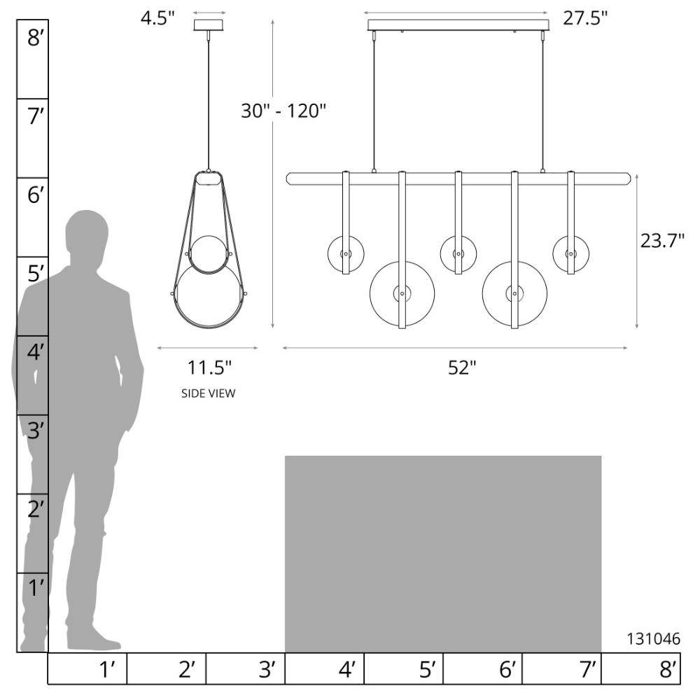 Cable-hung adjustable height LED linear Pendants light with wood details, leather accent straps and a black canopy. Please note that natural color variations will occur with genuine leather. Characteristics will differ from hide to hide with how each hide absorbs the dye