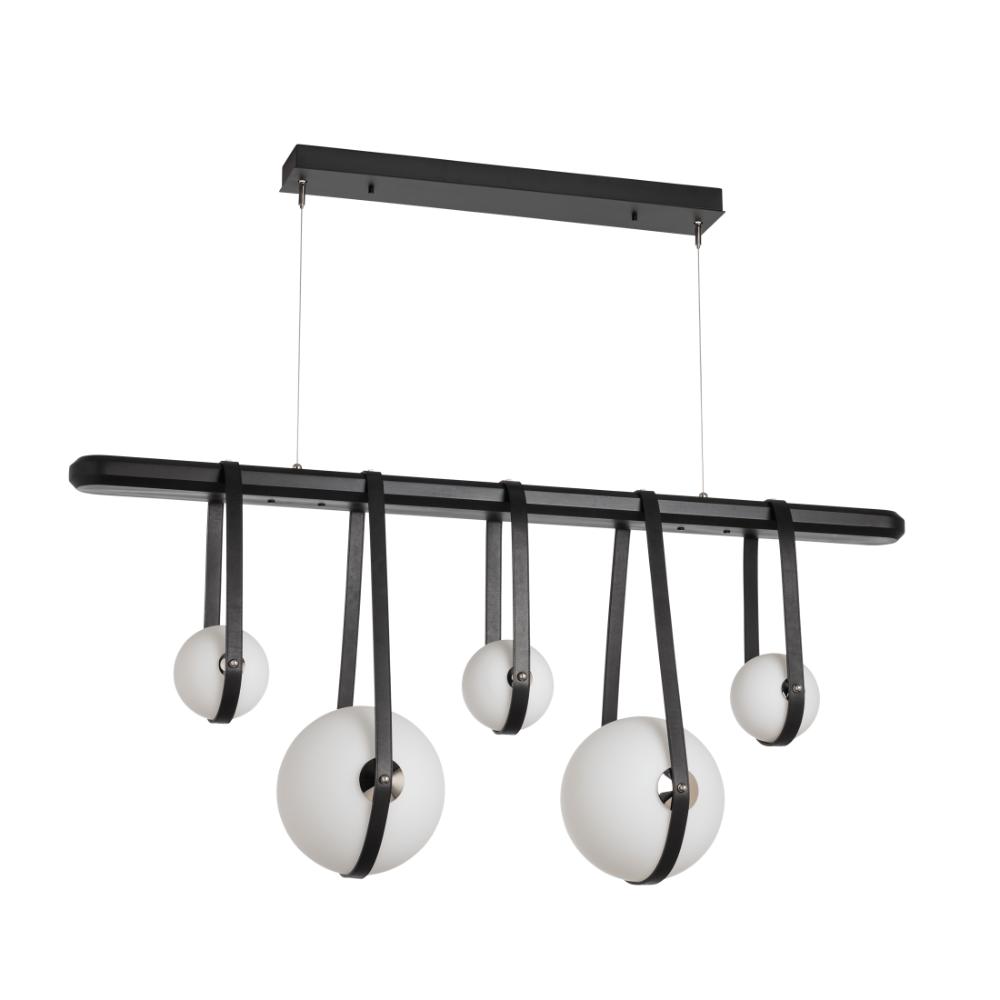 The Derby Collection grows to include this Derby 5-Light LED Linear Pendants. Five opal glass globes, three small and two large, are hung via leather straps (available in 3 color options). A choice of Antique Brass or Polished Nickel disc fittings set off the leather straps and globes that are suspended from a maple wood traverse, (choice of maple wood, available in natural maple, or black maple).