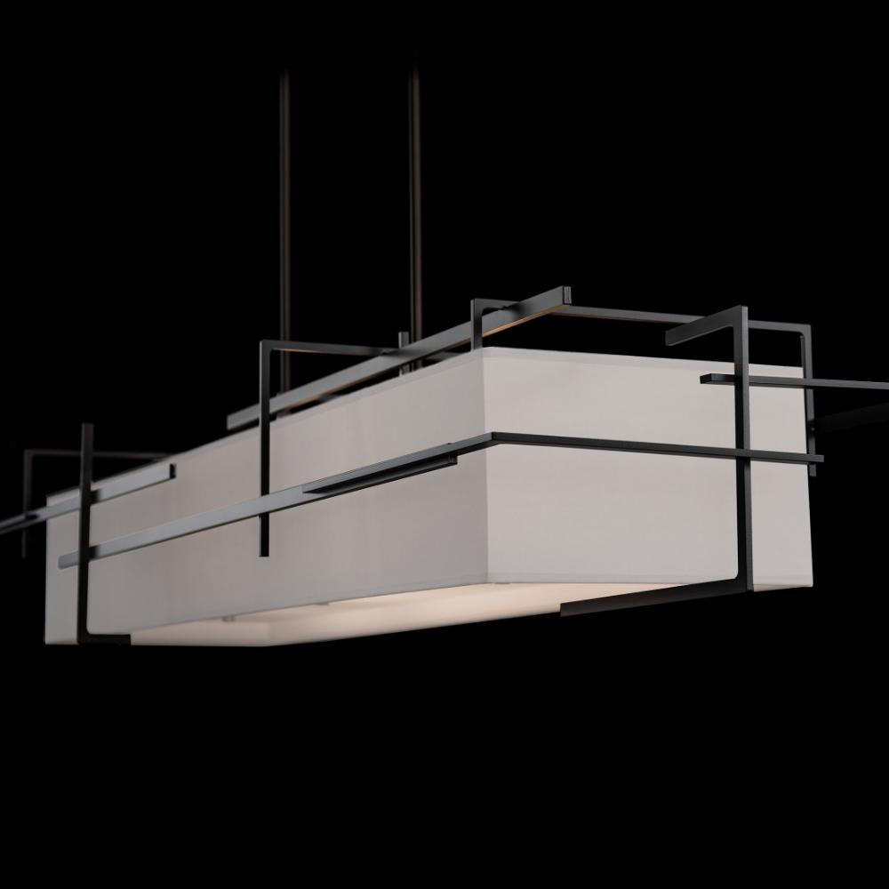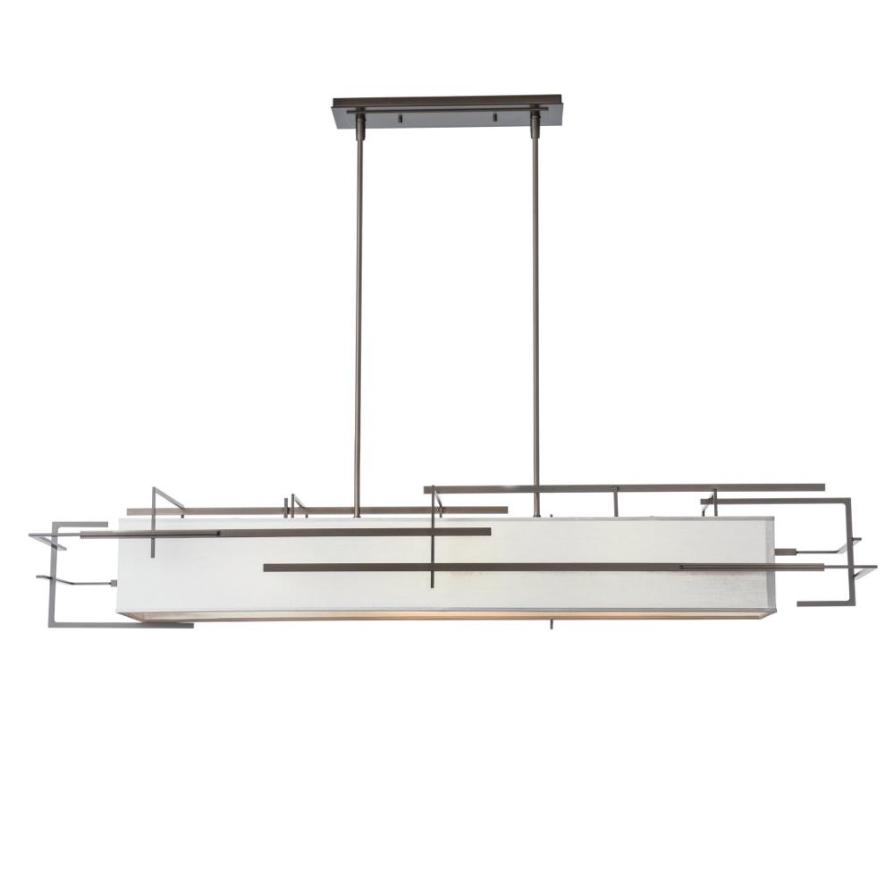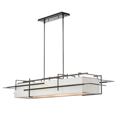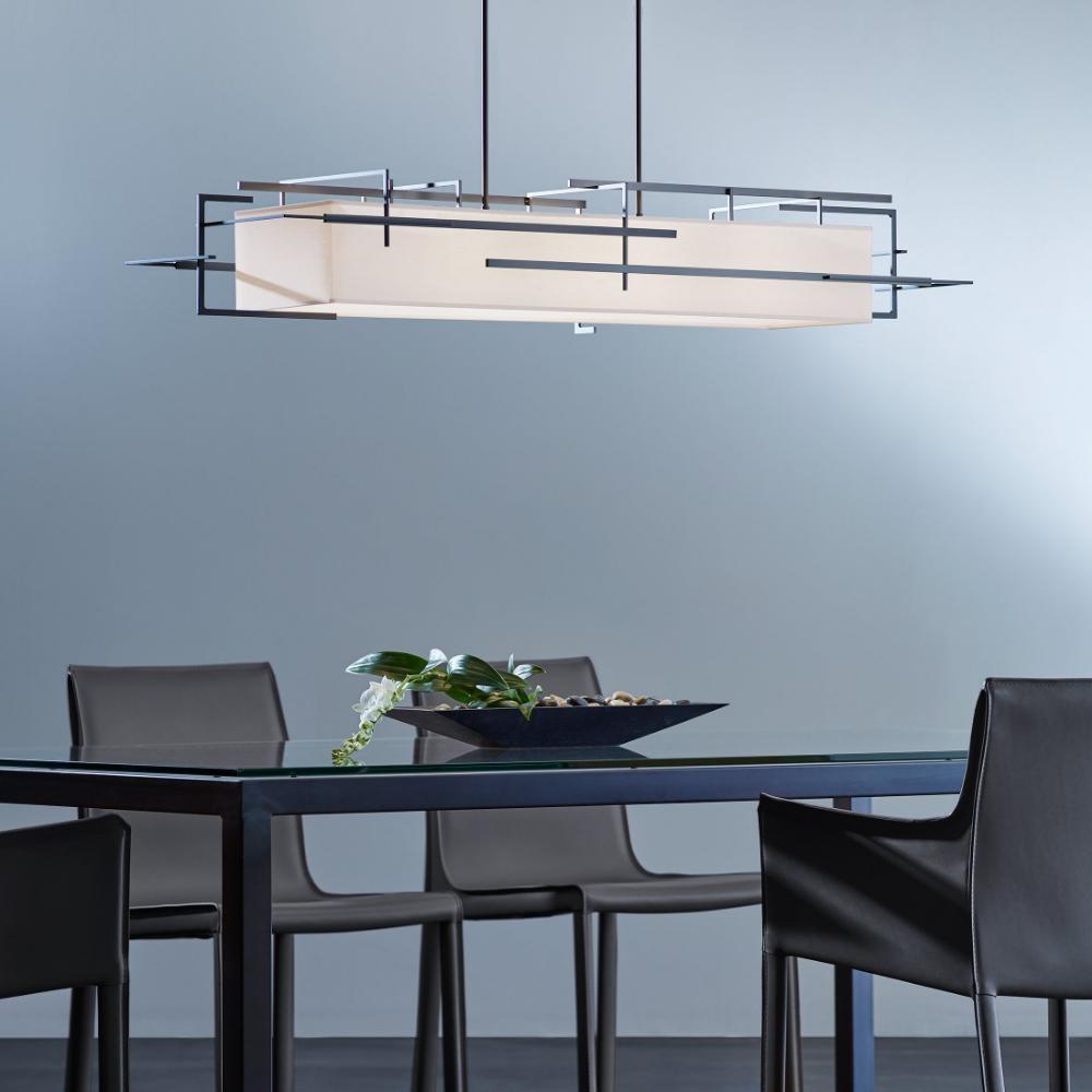 A modern take on a classic form, the Etch Pendant is full 54" in width. A classic, rectangular shade is held within an abstract, Mondrian-esque hand-forged steel exoskeleton with clean lines and angles. An impressive and versatile lighting pendant is suited to a variety of design styles.