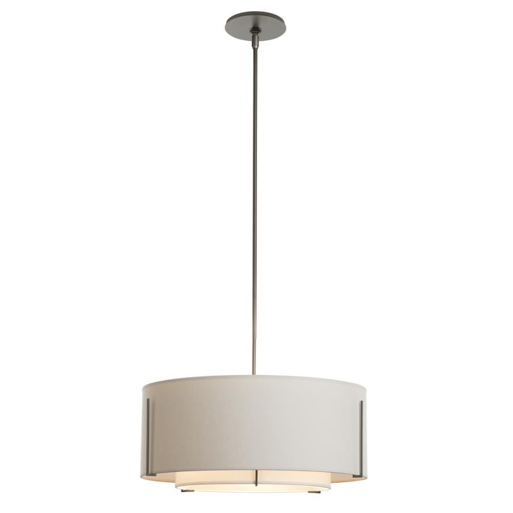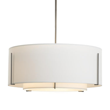 The double-shade design of this pendant delivers the sleek, clean and minimalistic elegance the Exos Collection is known for. Concentric drum shades are cradled by hand-forged steel bars.