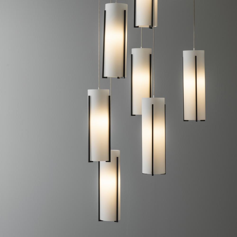 The storied Exos Collection welcomes the addition of this multi-port with nine cascading pendants clustered on a round canopy. Staggered lengths, customizable to suit the space, make this Exos 9-Light pendant and easy choice. Three tall, vertical, handcrafted steel pieces hold the glass shade within its embrace. Shades are offered in a choice of opal or clear glass.