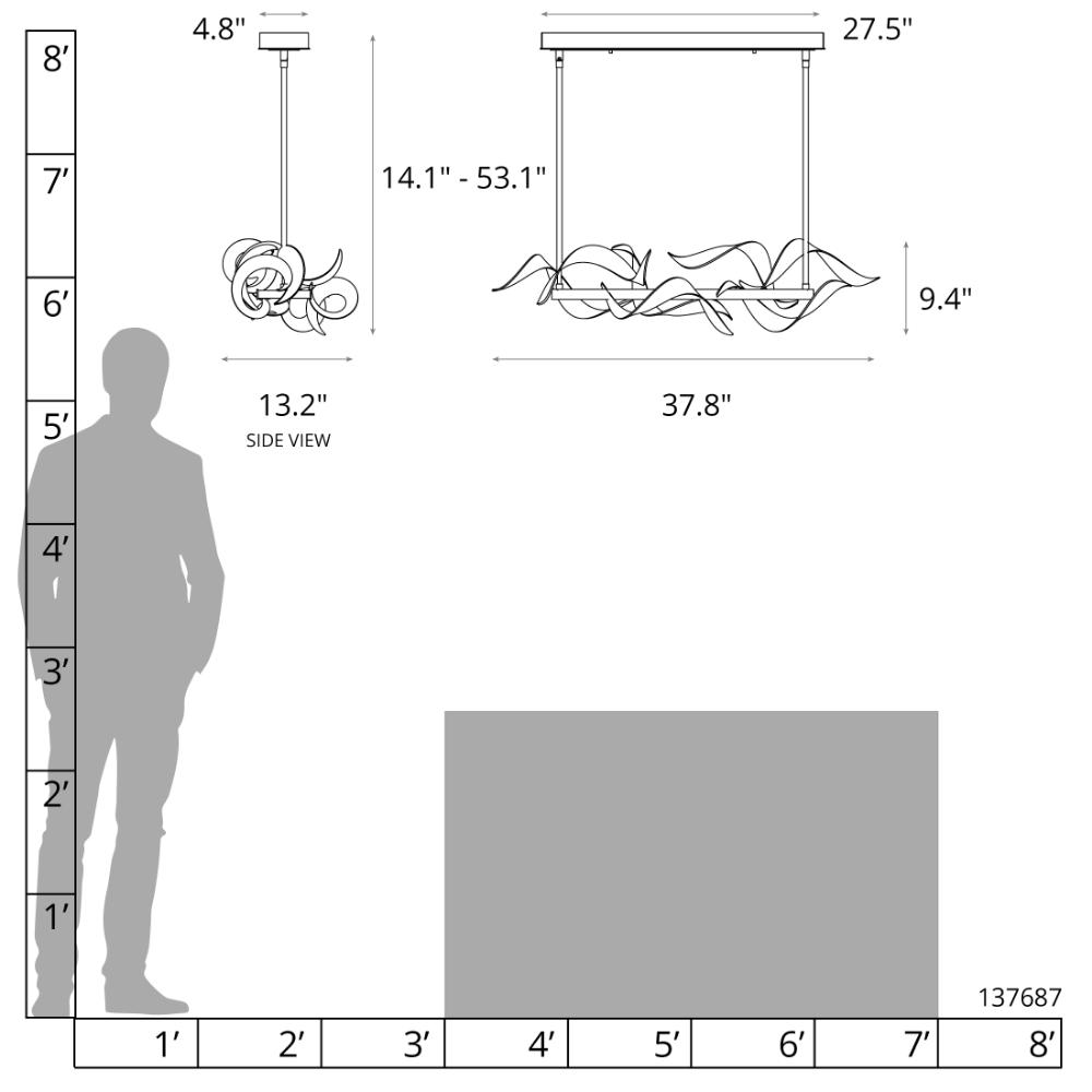 Hand-forged steel ribbons seem to dance around the horizontal frame that houses the LED components of this pendant. The light reflecting from the ribbons creates a captivating glow that draws the eye to the fine craftsmanship that goes into the piece.