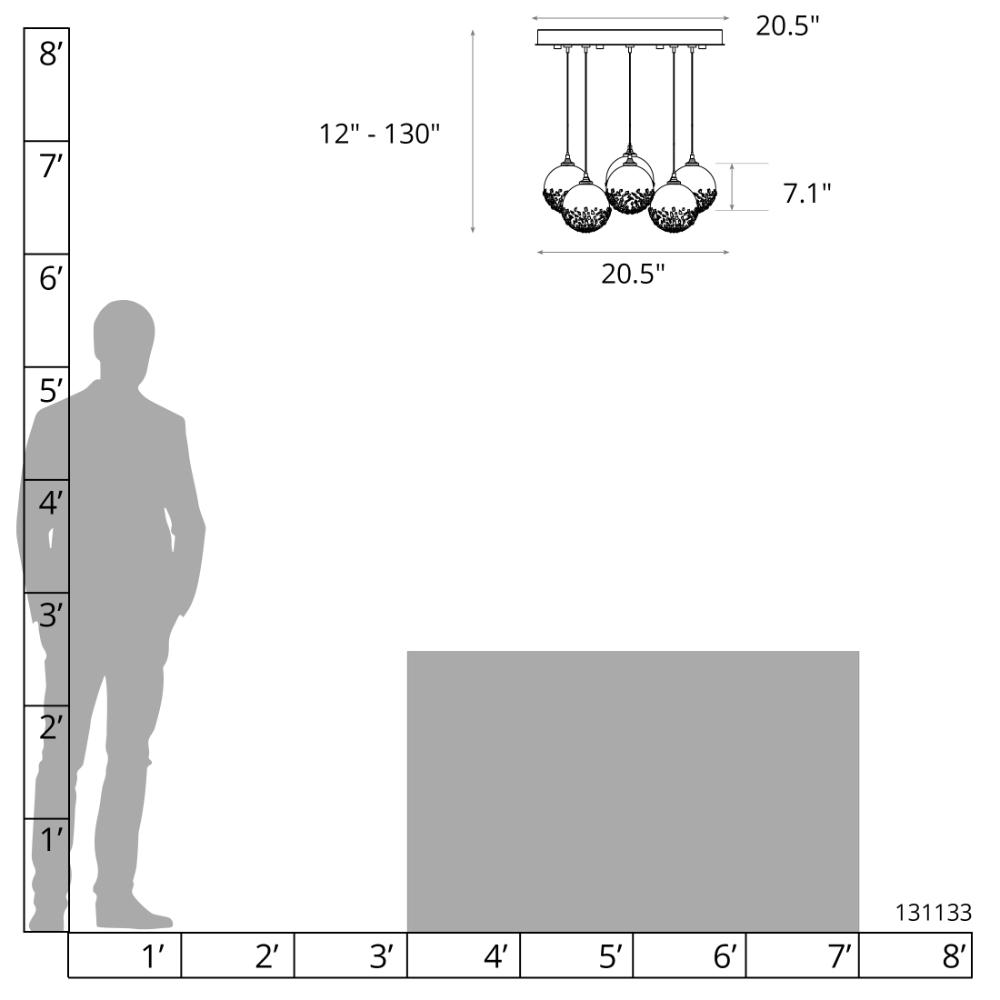 Nine Fritz Globe pendants hung from a circular canopy. Each pendant may be individually adjusted for a custom look. Note, the upper canopy can will always be black while the canopy faceplate will match the selected finish.- Sloped Ceiling: Adaptable to 45 degrees