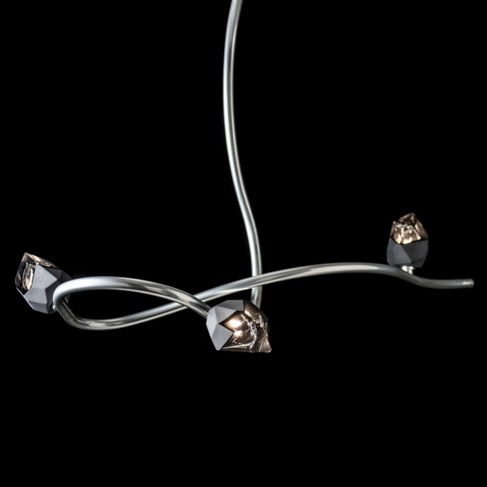 The sensual curves of the handcrafted steel body creates a sense of movement in space. 3 unique, handmade shades of thick, clear glass are encased in an outer cocoon of blown, colored glass, each polished to reveal an exquisitely clear inner glass layer beneath.