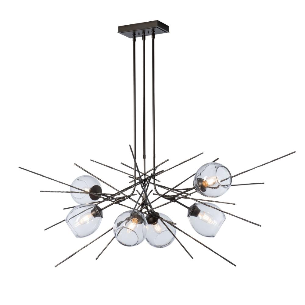 Transitional 6-light pendant with finish options and clear blown glass.- Sloped Ceiling: Adaptable one way to 45 degrees