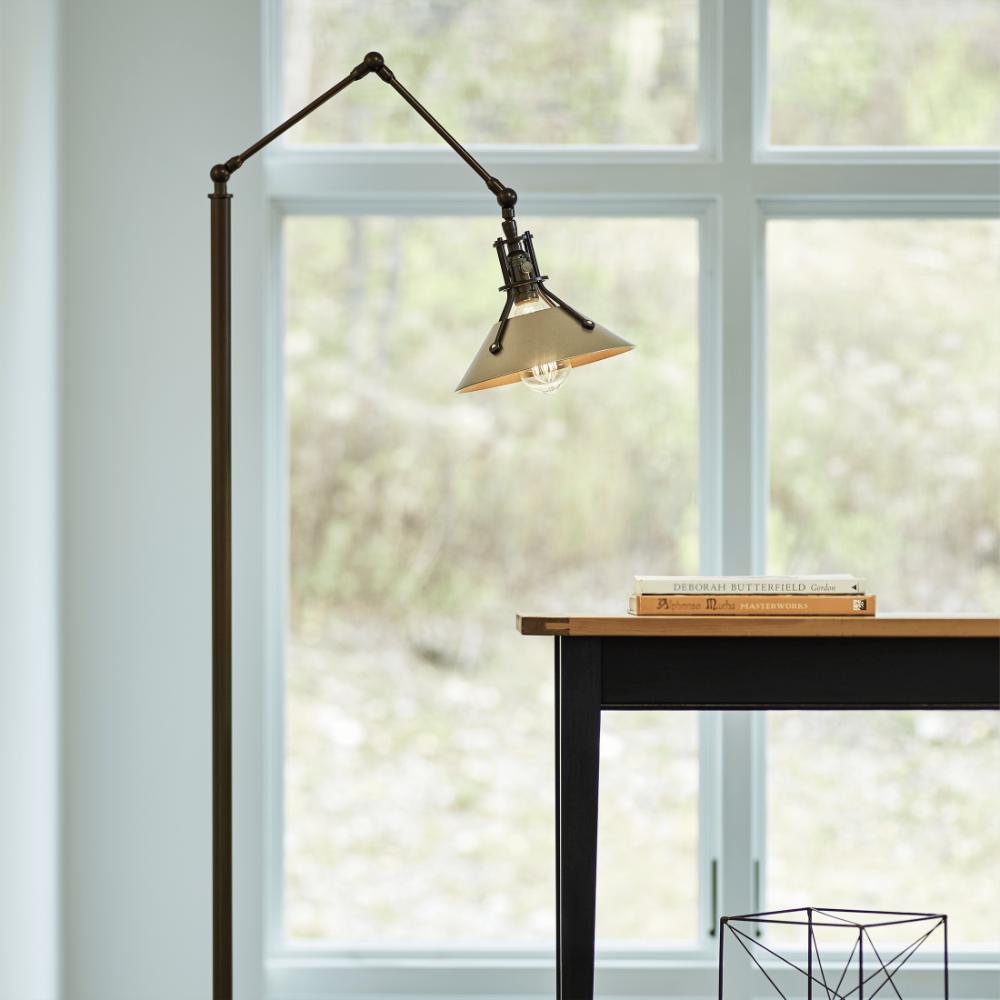Adjustable swing arm floor lamp with a spun metal shade with brass rivets and a dimmer on the socket. Choose a base finish color for the base, pipe and socket and an accent finish color for the shade.
