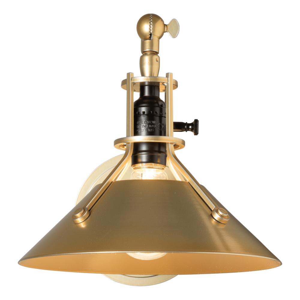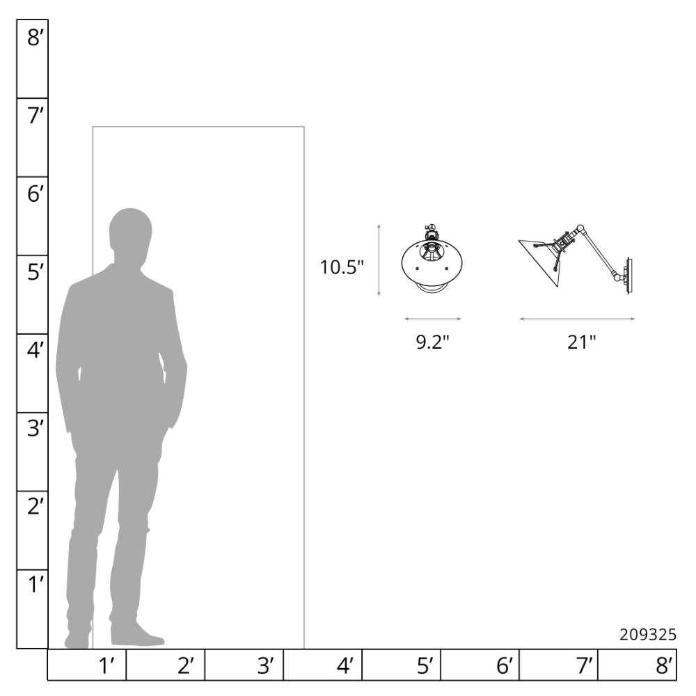 Direct wire adjustable swing-arm wall sconce with a steel shade. Thumb screws on the sconce arm allow for vertical height adjustment while a swivel at the baseplate allow for side-to-side adjustment of 25° in each direction. Dimmer switch on socket. Choose a base finish color for the base, pipe and socket and an accent finish color for the shade.