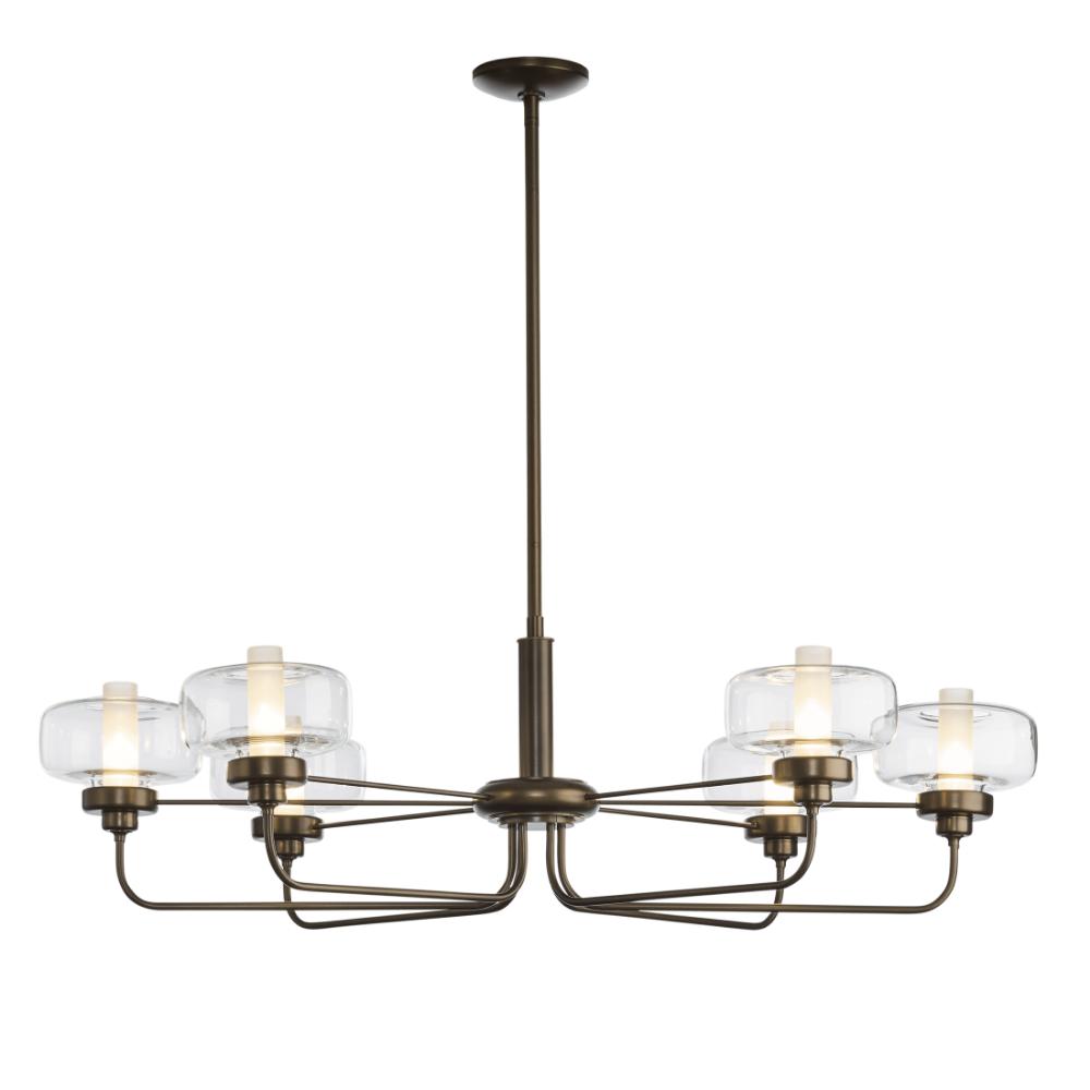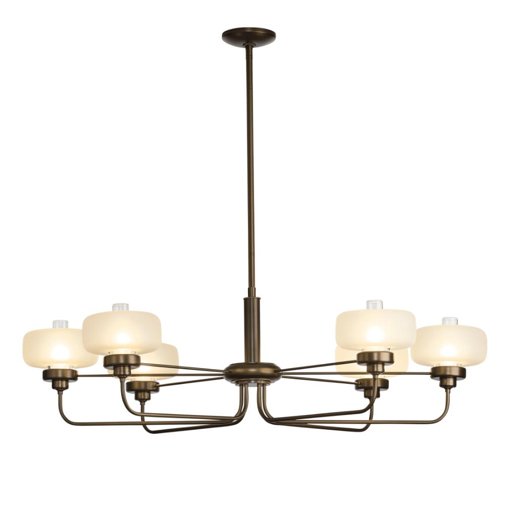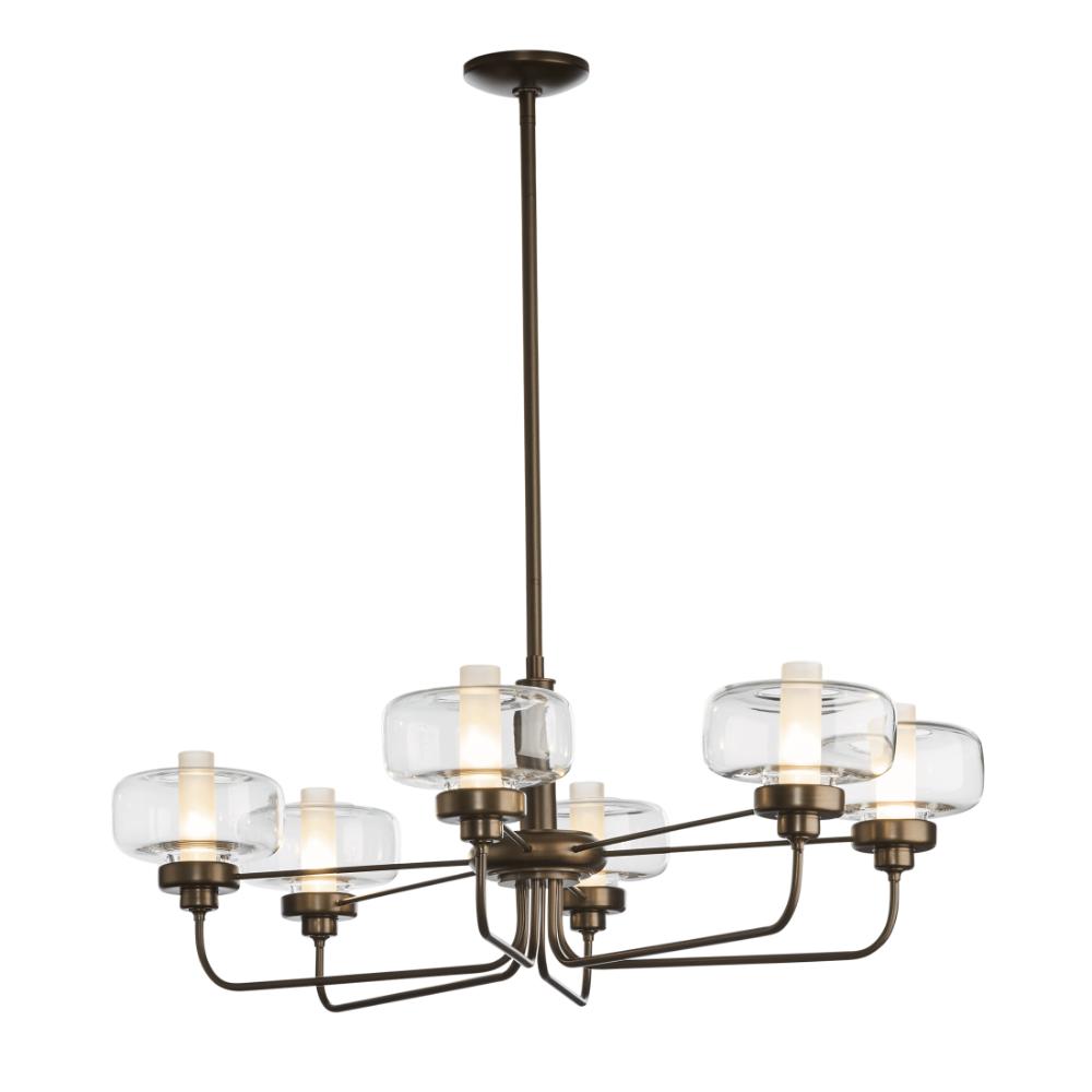 Adjustable pendant chandelier with finish and choice of Clear or Frosted glass. Includes a multi-height stem kit with three 12" pipes, one 6" pipe and one 3" pipe.- Sloped Ceiling: Adaptable one way to 45 degrees