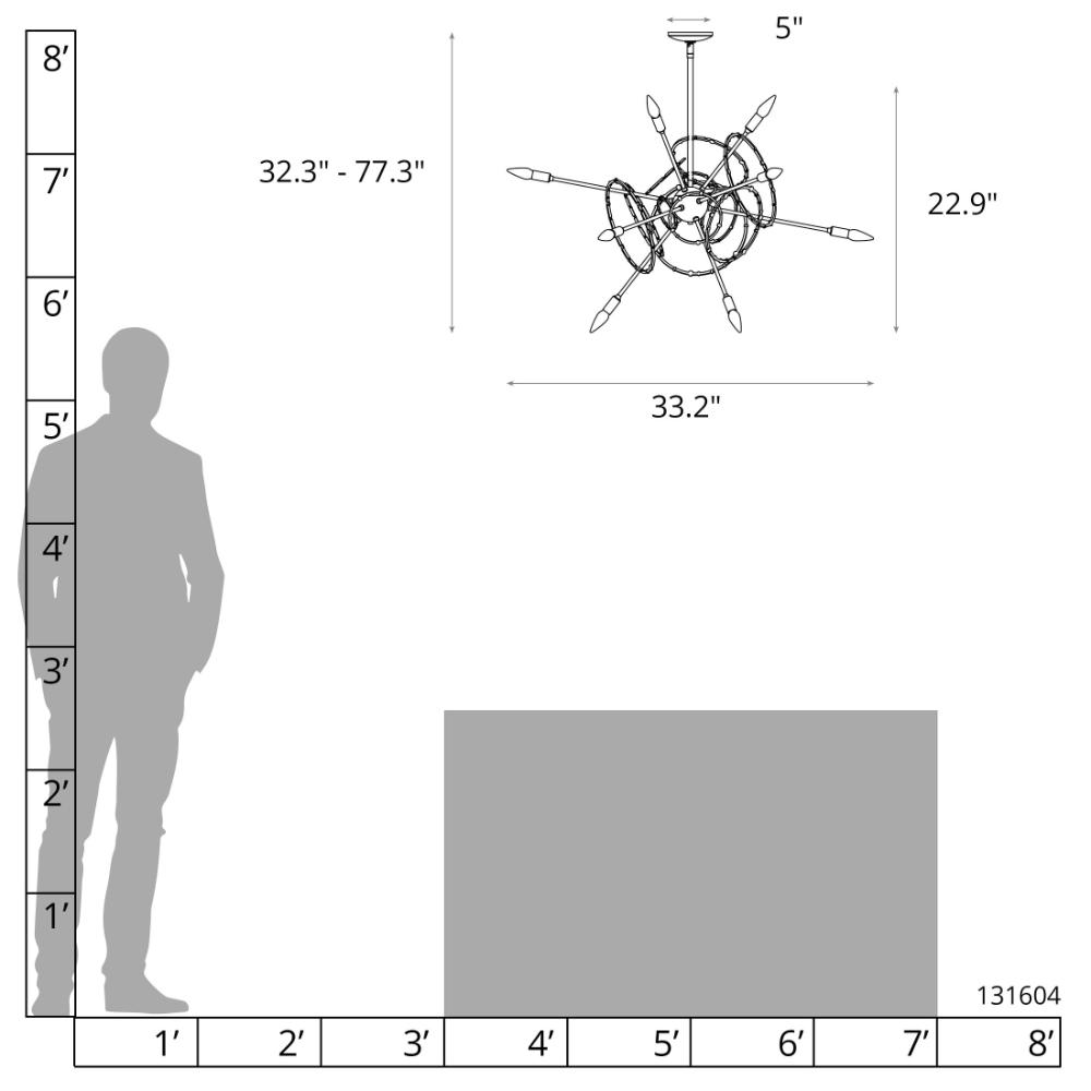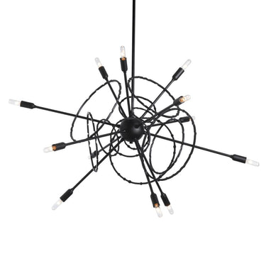 Twelve light adjustable height starburst sputnik chandelier pendant light with exposed bulbs. Includes a multi-height stem kit with three 12" pipes, one 6" pipe and one 3" pipe.- Sloped Ceiling: Adaptable to 45 degrees