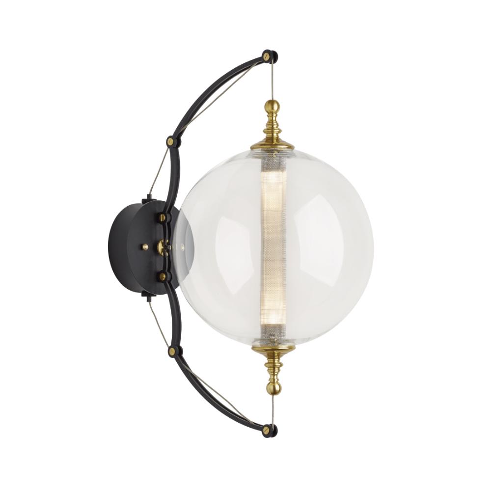 Direct wire interior wall sconce in Black finish with brass accents and a clear glass shade.