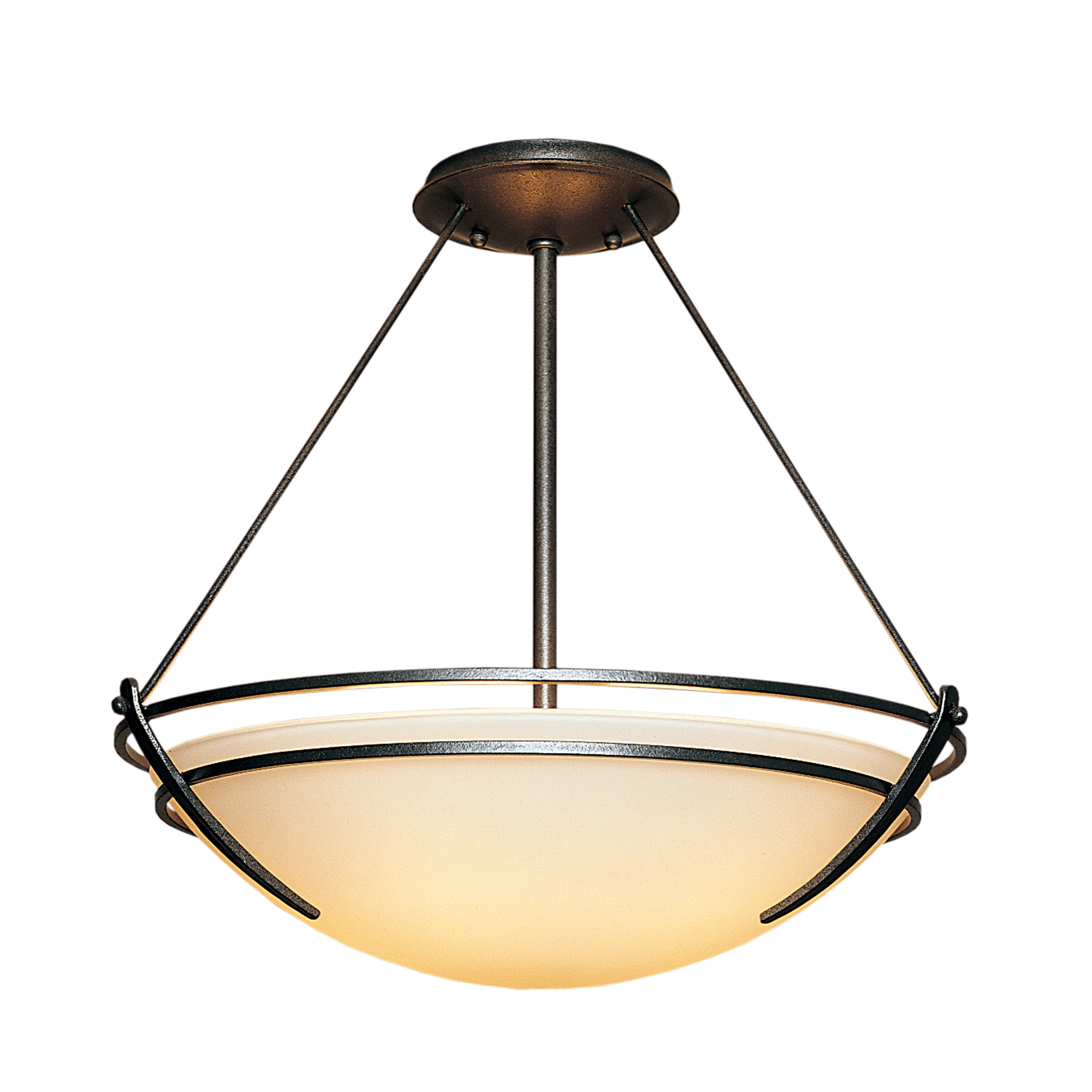 Concentric steel bands circle the glass bowl. Handcrafted steel tines hold the bowl. This modern fixture is crafted using a mix of tradition and technique by artisans at our forge here in Vermont.