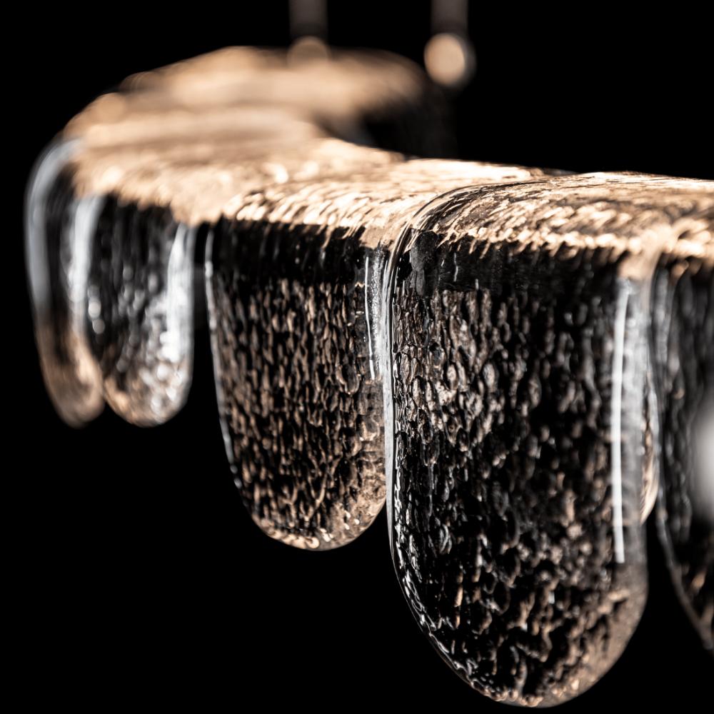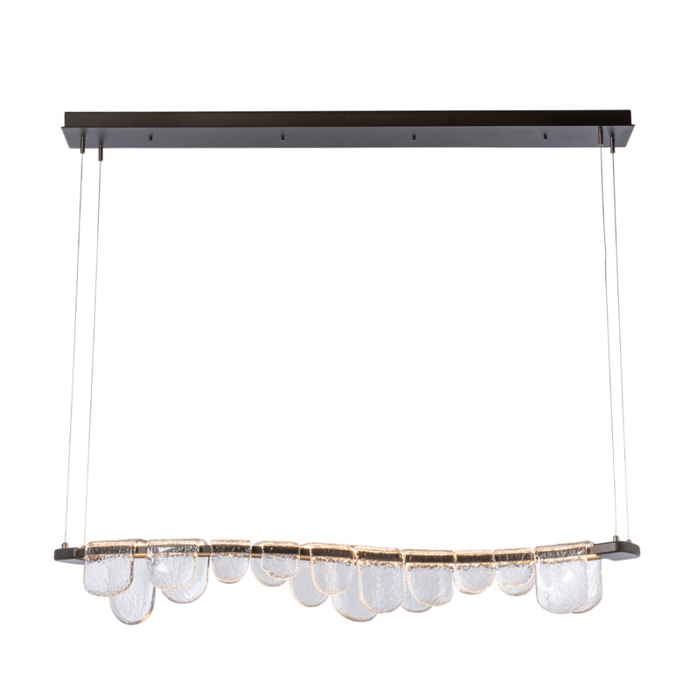 Inspired by the cold icy streams of Vermont that are adorned with ice covered rocks and frozen boulders, this riverbed of light with meandering artisan glass is stunning. Featuring a curved LED light-guide platform, the Riverbed Pendant's unique, clear, textured poured glass has been formed and shaped like frozen stones along the river's edge by our local partner, AO Glass, working with HF designer Andy Morter.