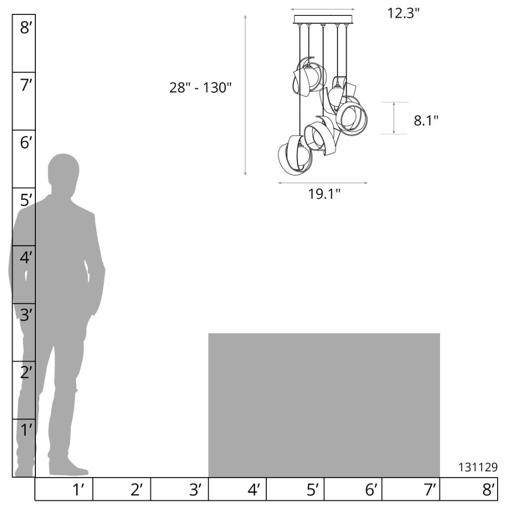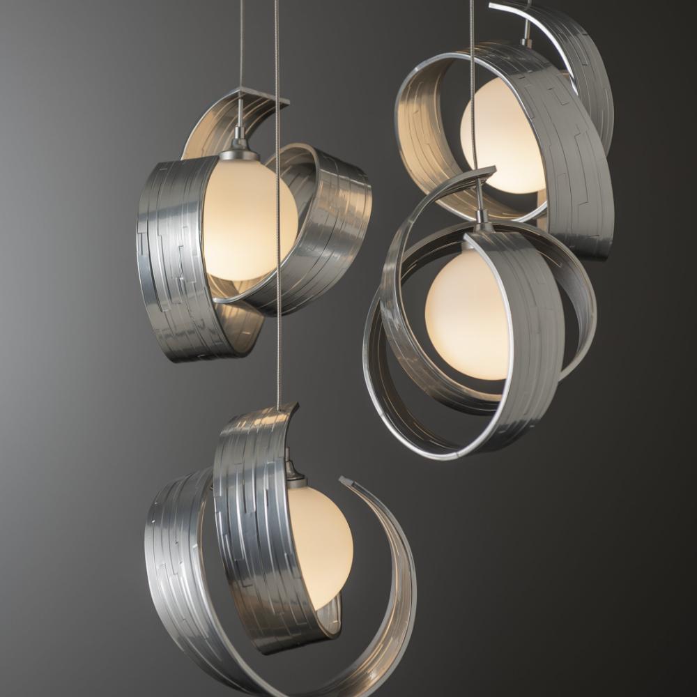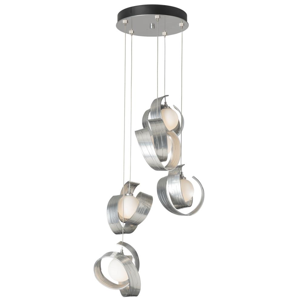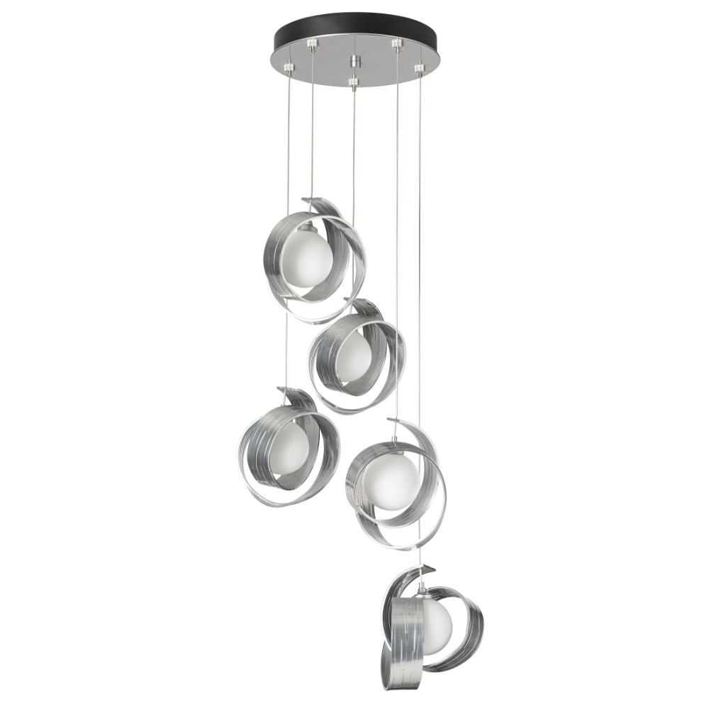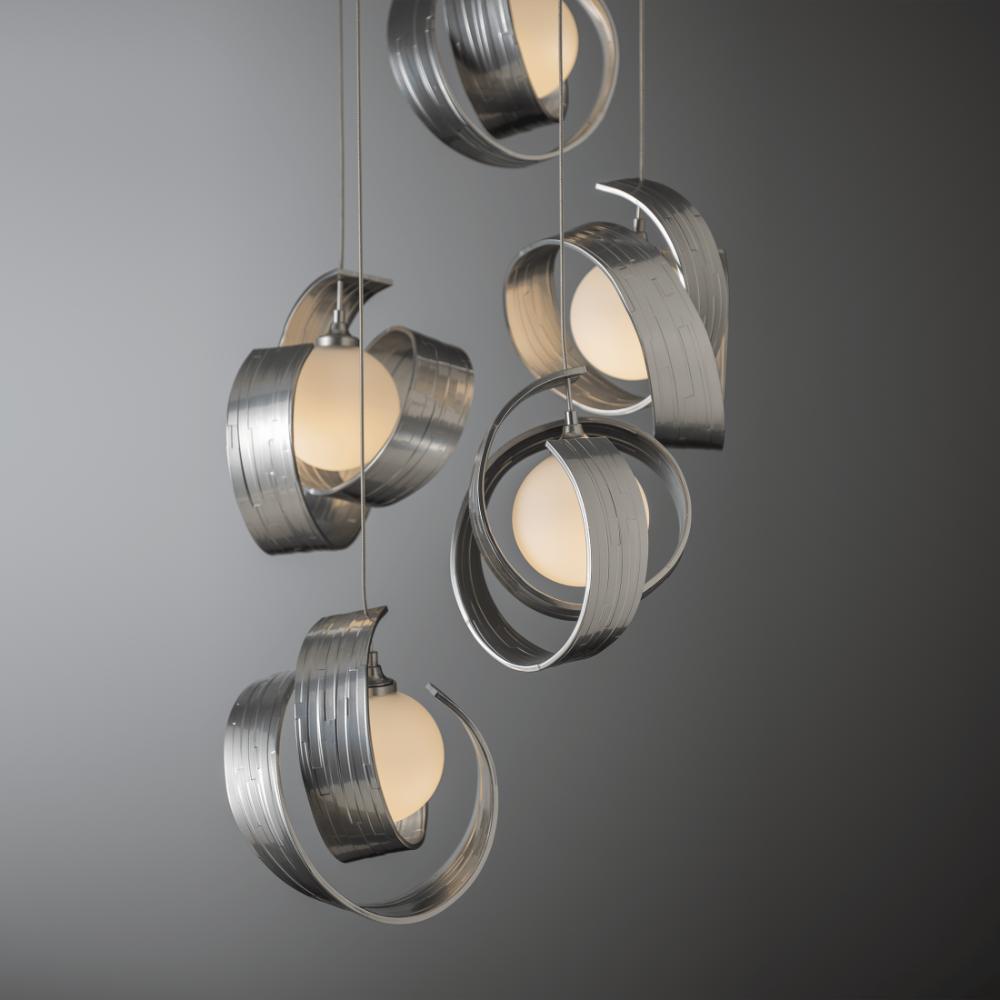 Five light pendant with hand-formed sculptural aluminum ribbons hung from a circular canopy. Each piece will feature subtle variations due to its hand-made nature. Each pendant may be individually adjusted for a custom look. Note, the upper canopy can will always be black while the canopy faceplate will match the selected finish.- Sloped Ceiling: Adaptable one way to 45 degrees