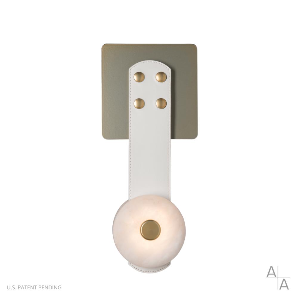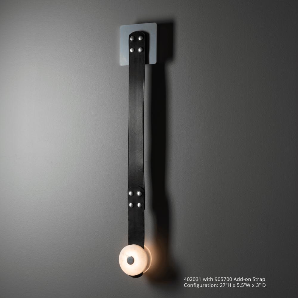 Modular LED wall sconce with leather strap and alabaster details. Includes one alabaster LED module, a 12" leather strap and a square steel wall mount. Note: Alabaster is a natural material and comes in a wide variety of color and marks. No two pieces are the same. Additional LED arrays may be purchased individually if desired. See Installation Instructions for more details.