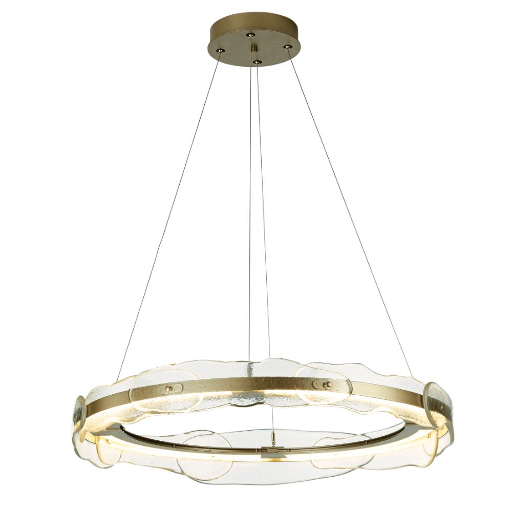 A graceful surround of hand-poured art glass entices you to contemplate the beauty of this pendant. Each of the textured glass panels is unique - handmade by the Vermont-based artisans at AO Glass.