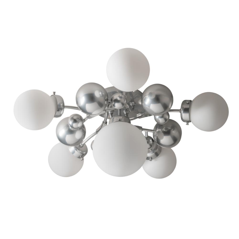 Six-light semi-flush ceiling light with forged steel details and glass globes. The Opaline glass option is hand-blown and will contain natural variances in tone from piece to piece.