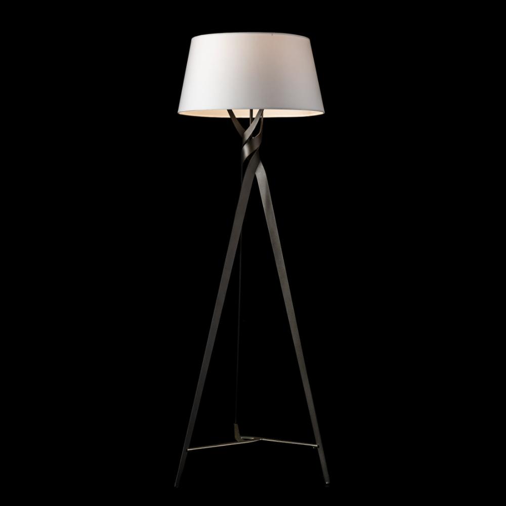 Tripod floor lamp with a fabric shade. Dimmer switch located on socket. Choose a finish for the legs and an accent finish for the leg brace detail.