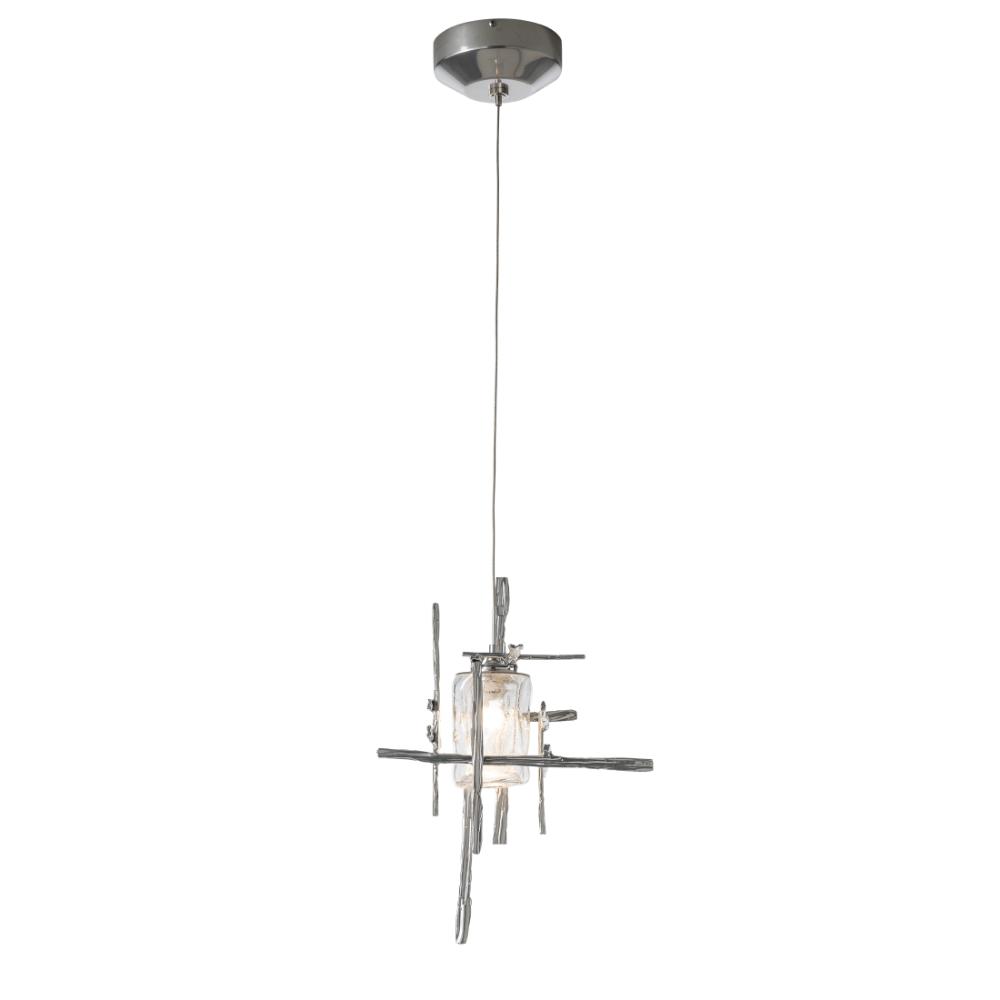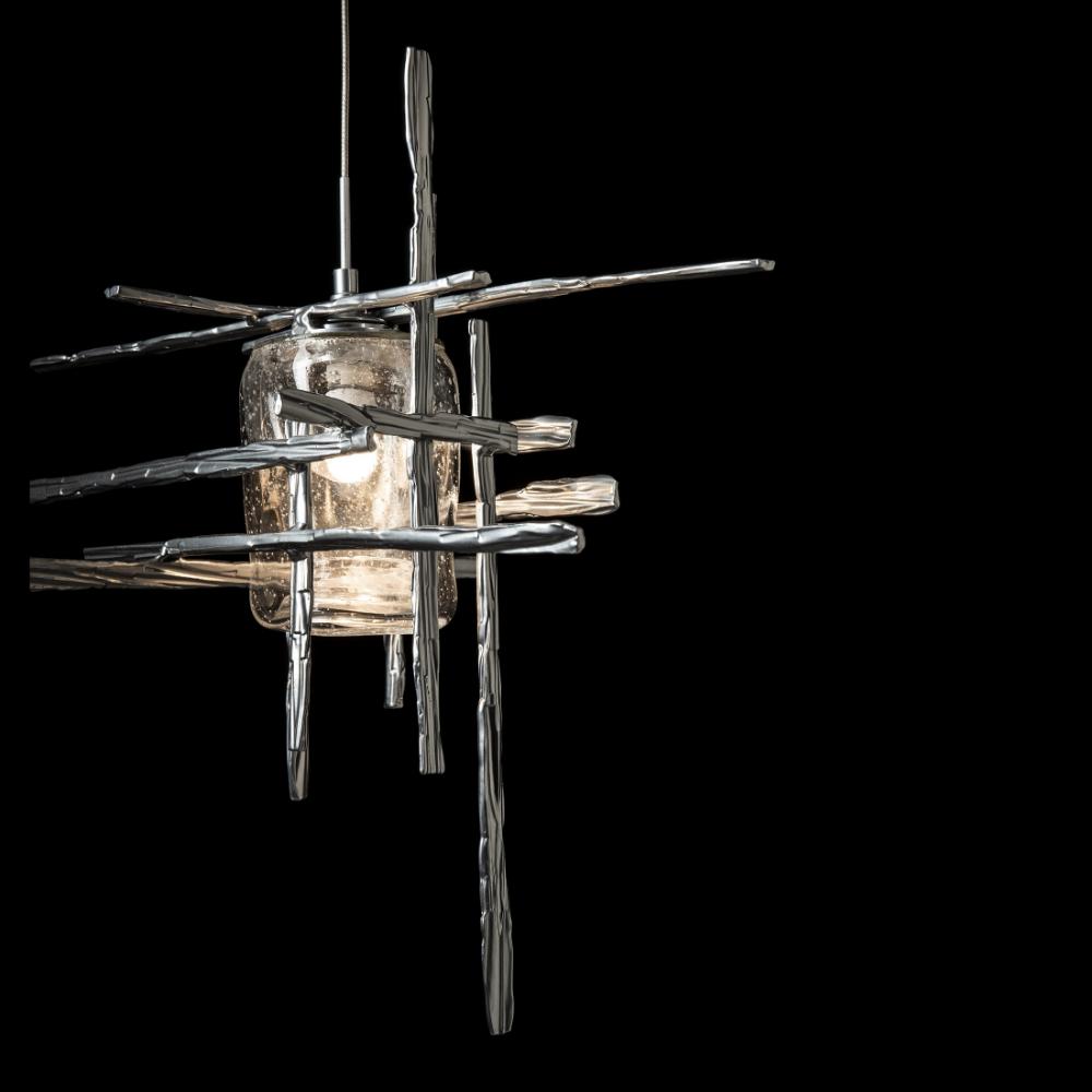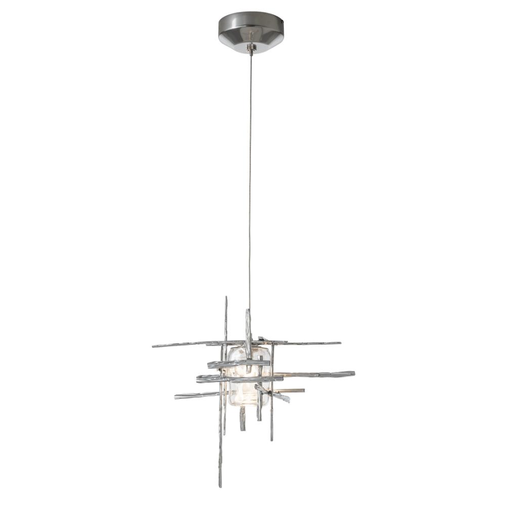 This Tura Mini Pendant is composed of perpendicular, intersecting handcrafted annealed aluminum pieces that form an exoskeleton that surround a thick, clear double layer of seeded glass. Suspended from a discrete round canopy, electricity is delivered via the pendant's low voltage cable. Available in all standard finishes.
