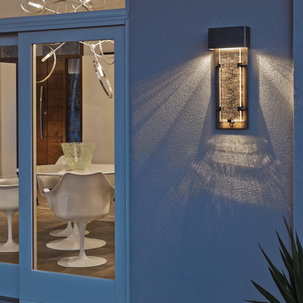The Ursa features a thick panel of seeded glass that glows like its constellation namesake. The LED source is concealed behind the top metal enclosure, allowing the light to stream through the vertical glass panel below. It looks amazing indoors too.