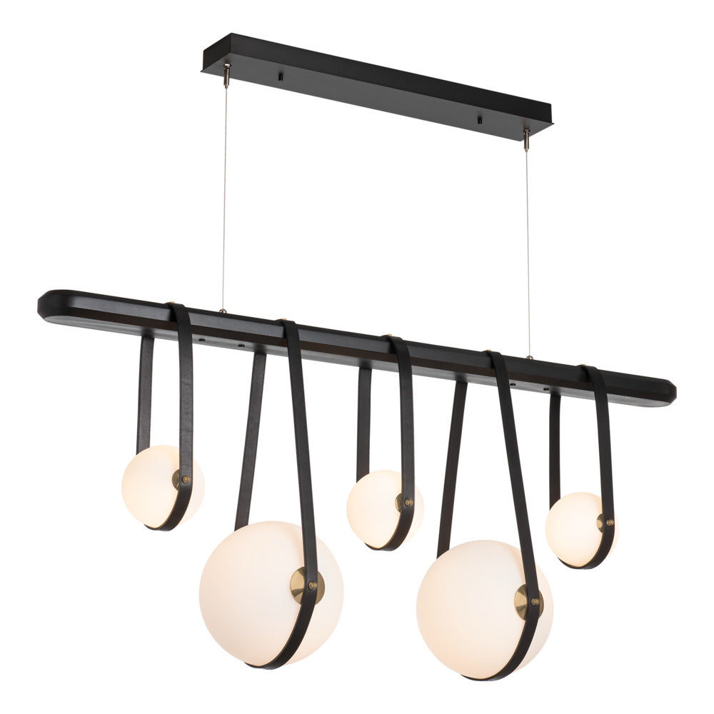 Cable-hung adjustable height LED linear pendant light with wood details, leather accent straps and a black canopy. Please note that natural color variations will occur with genuine leather. Characteristics will differ from hide to hide with how each hide