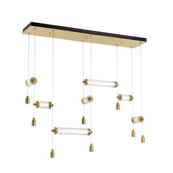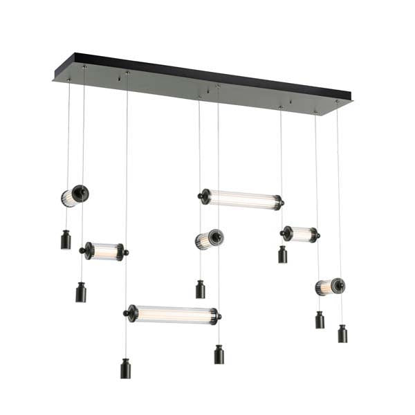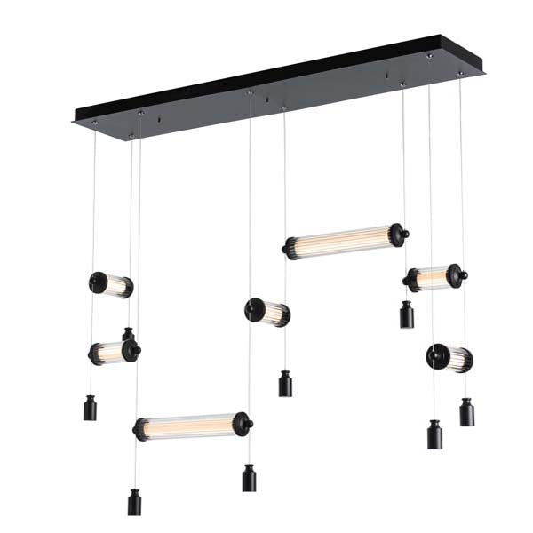 Adjustable height cable-hung statement LED pendant featuring seven ribbed glass cylinders with integrated LED arrays suspended from a rectangular linear canopy. Each LED array may be individually height adjusted from 15" to 100". Additional LED arrays may
