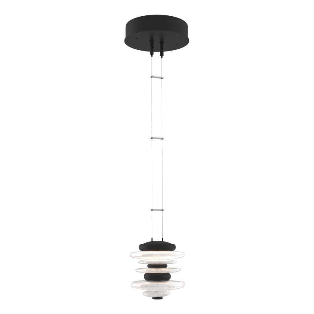 Adjustable cable-hung low-voltage LED mini pendant with glass and steel accents. Choose a finish for the decorative steel stones and the canopy faceplate. The upper canopy can will always be finished in black.