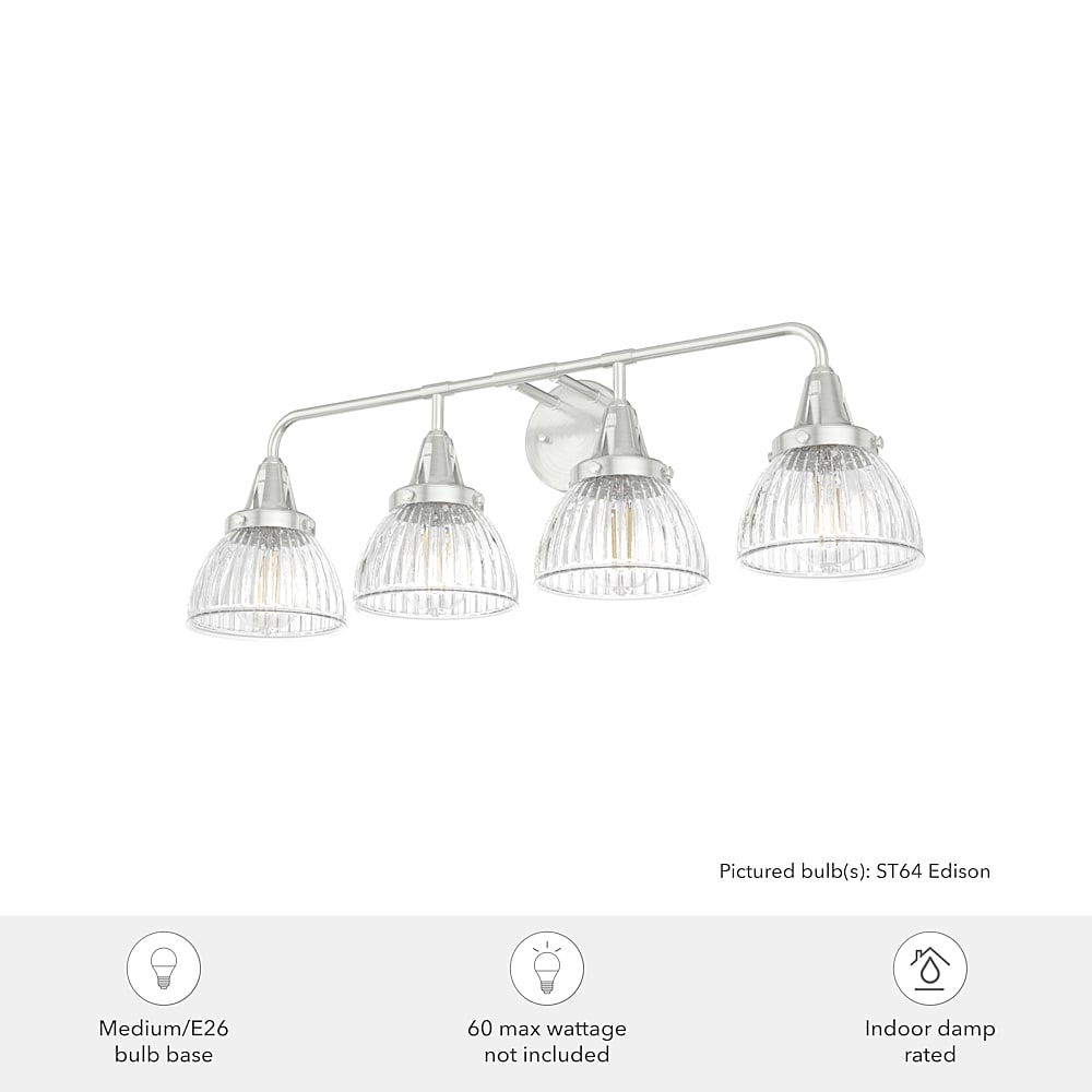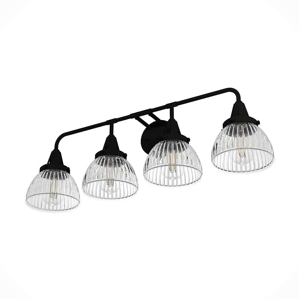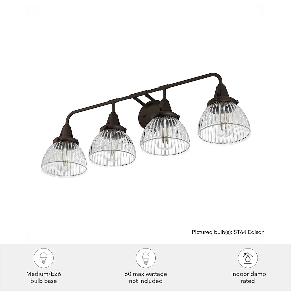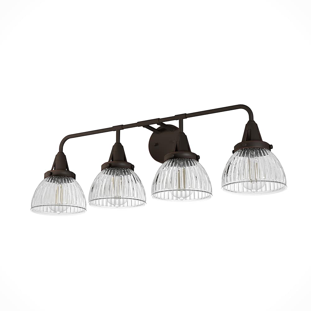 Strong details and with an elegant twist. The Cypress Grove 4 light vanity light pairs industrial form with intricate fluted glass to create something unforgettable. This indoor damp-rated fixture makes a statement in transitional and modern bathrooms. Carry this industrial theme throughout your space by pairing this vanity light with other fixtures fro the Cypress Grove collection.