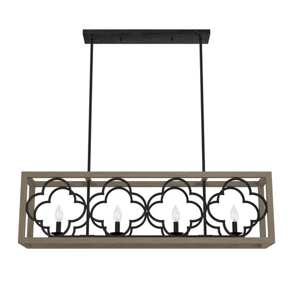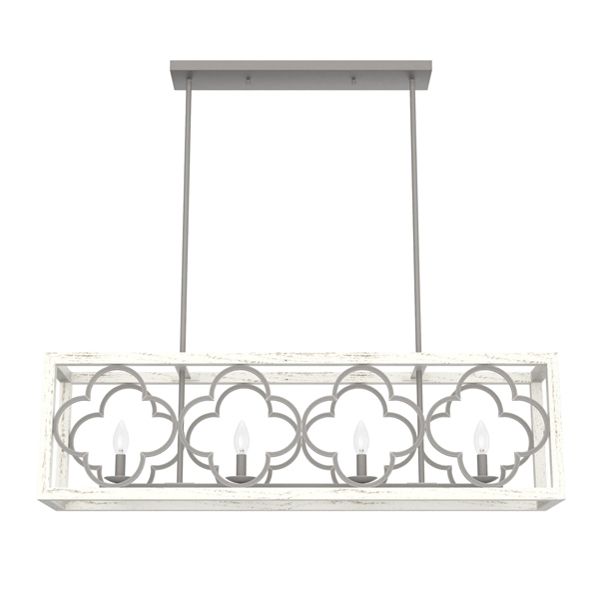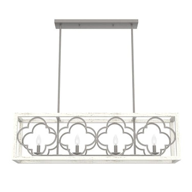 The repeating quatrefoil design coupled with the distressed finishes of the Gablecrest 4 light linear chandelier make for an elegant yet inviting fixture above dining room tables. The Victorian and European influences in this farmhouse linear chandelier bring warmth and style to rustic and French country inspired spaces.