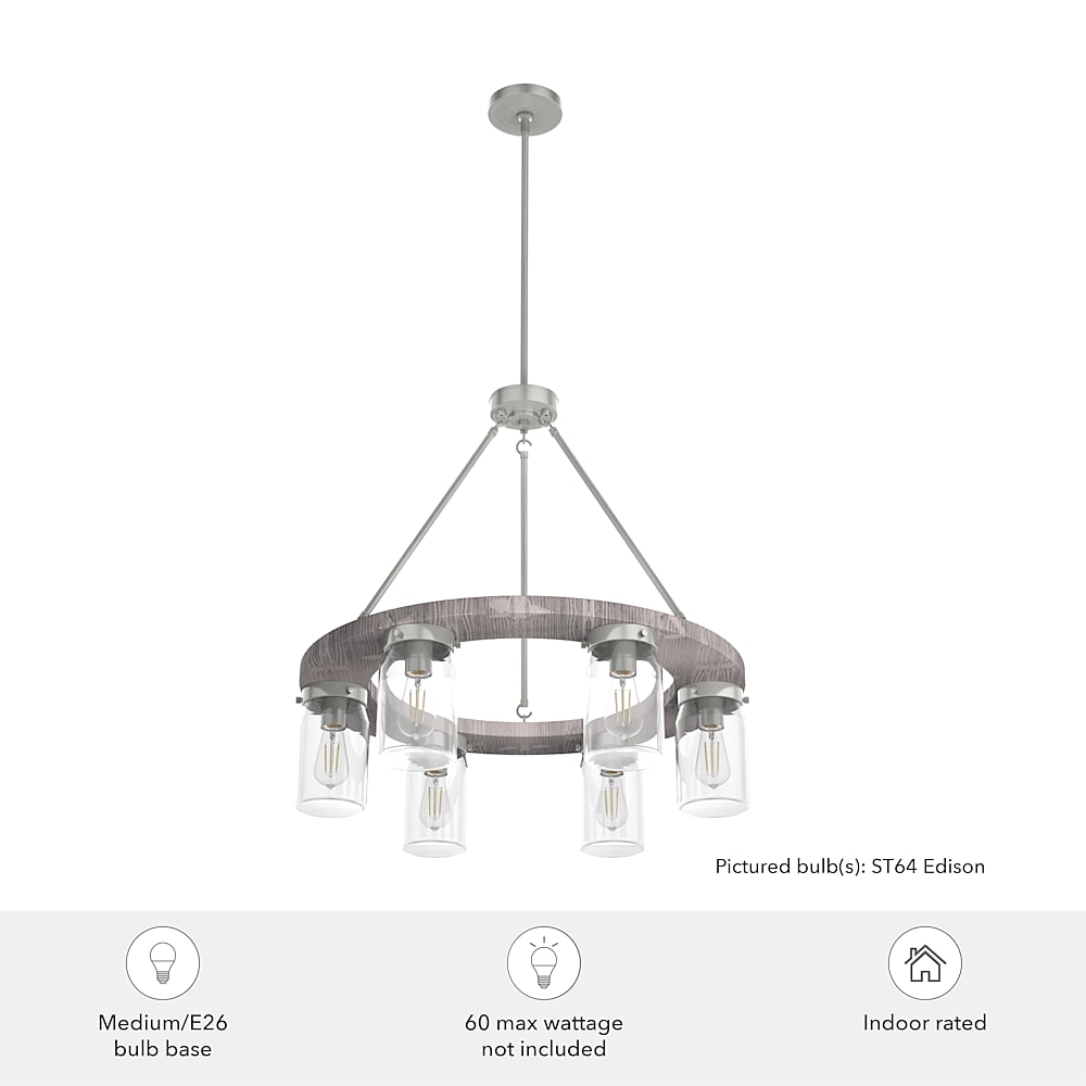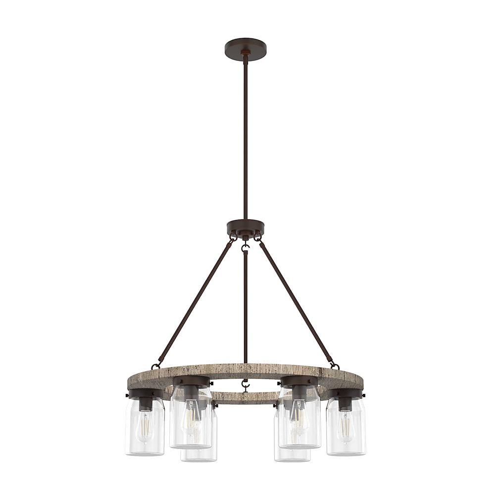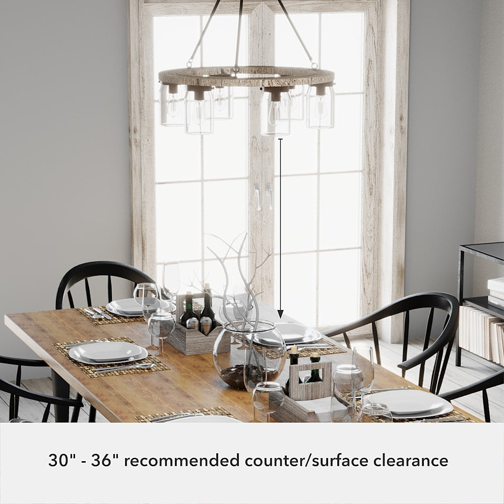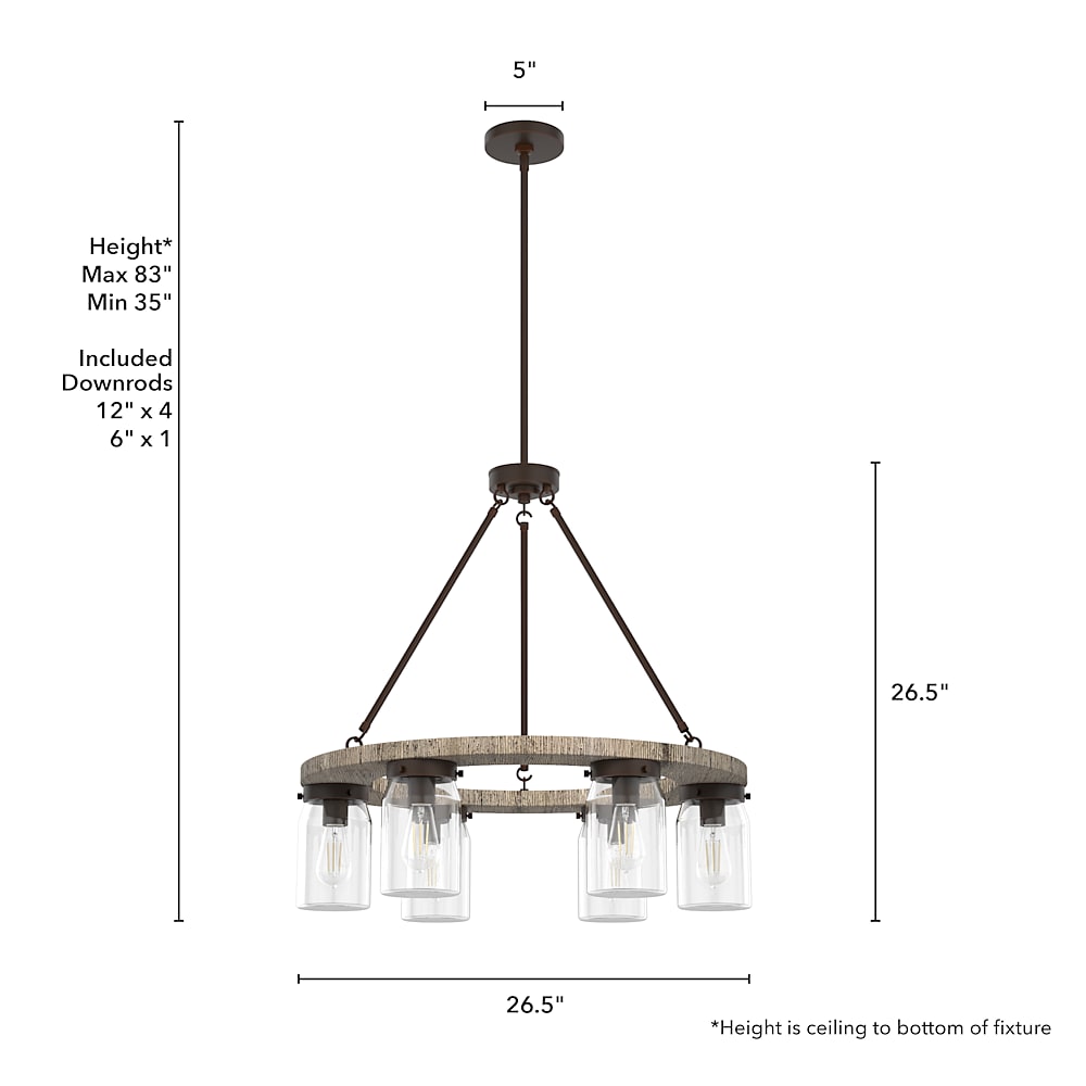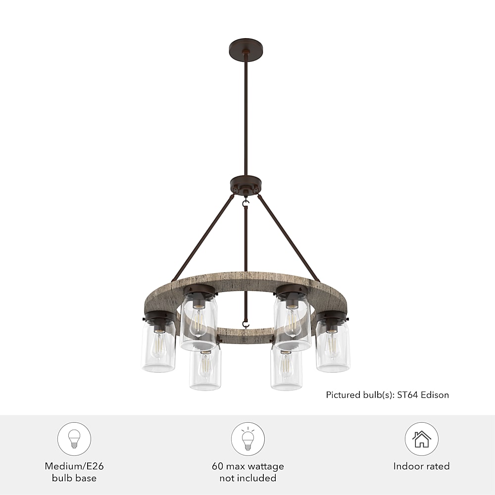 Simply charming, the Devon Park round chandelier's rustic wood finishes and ball jar inspired glass shades create a look perfect for rustic and farmhouse style spaces. This 6-light chandelier provides opportunity for ample lighting. The warm glow from Edison LED bulbs creates a welcoming ambiance in your space.