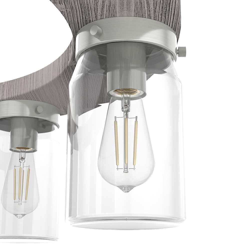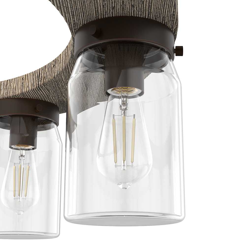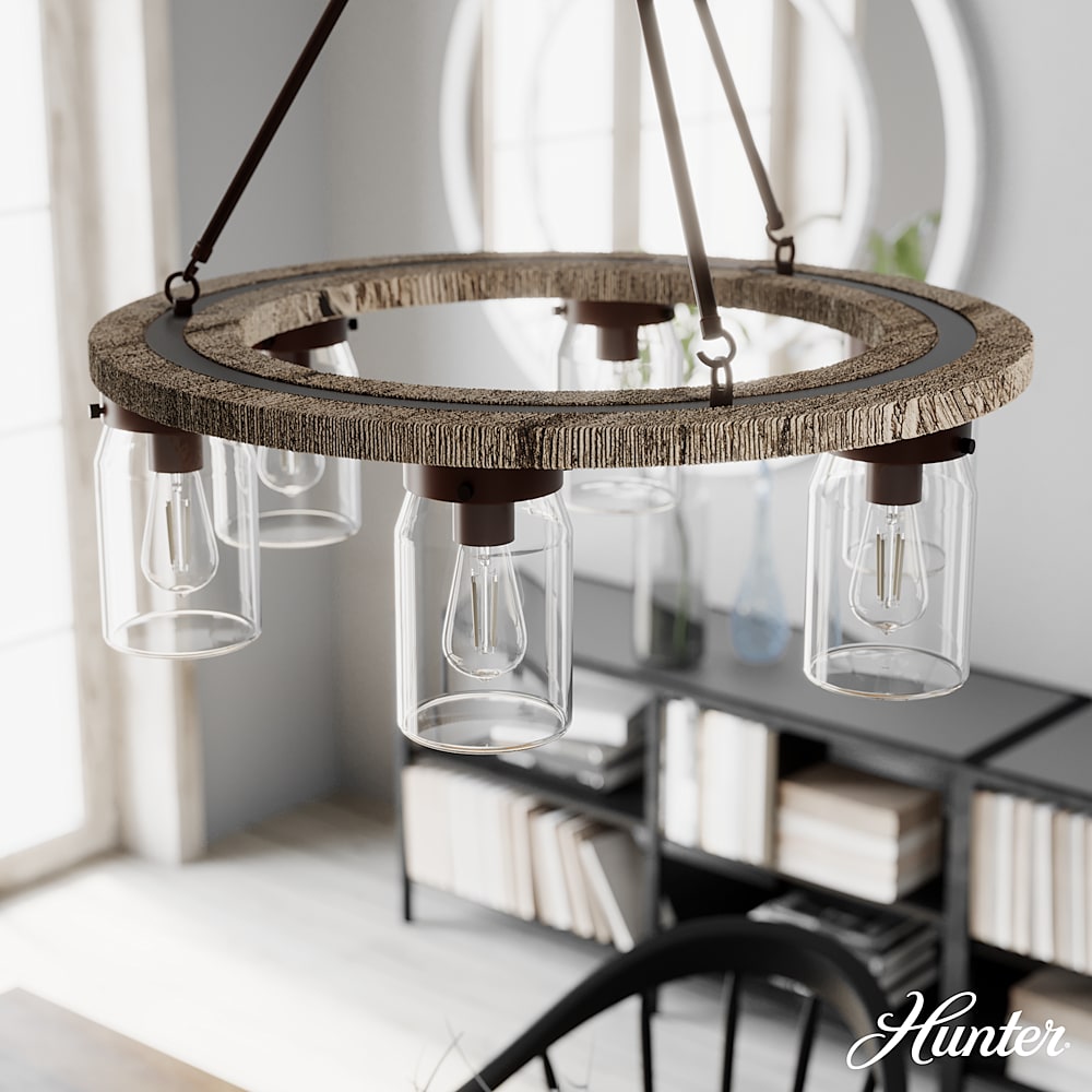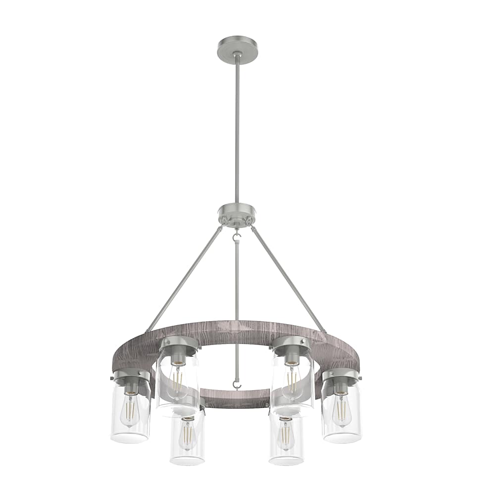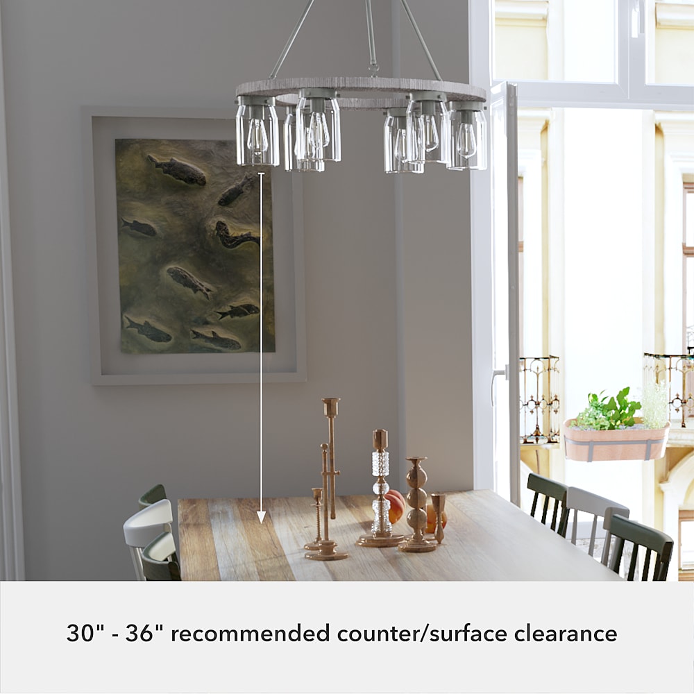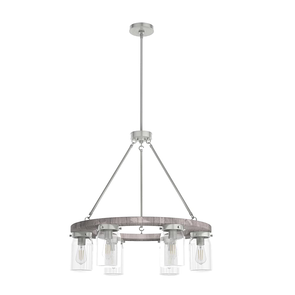 Simply charming, the Devon Park round chandelier's rustic wood finishes and ball jar inspired glass shades create a look perfect for rustic and farmhouse style spaces. This 6-light chandelier provides opportunity for ample lighting. The warm glow from Edison LED bulbs creates a welcoming ambiance in your space.