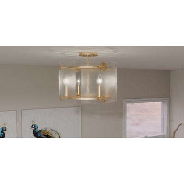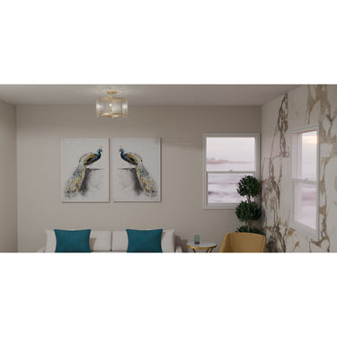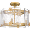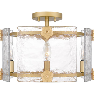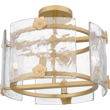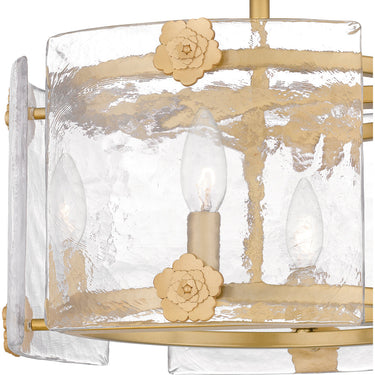 A light gold finish and clear textured glass are the highlight of the Jolie collection. Pretty gold flowers adorn the glass panels, adding a touch of feminine beauty to the classic design. Available as a semi-flush mount, mini pendant light or in two sizes of pendant light, Jollie is a charming addition to any living space.