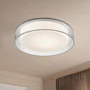 Clear round aesthetic glass. Opal glass cylindrical diffuser. Powder-coated white steel ceiling plate. Down light. Custom options available.