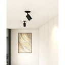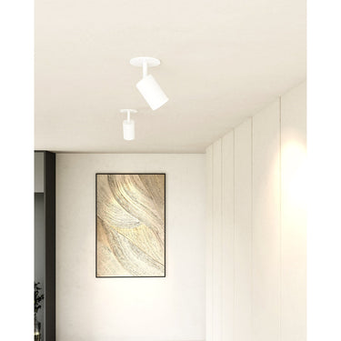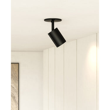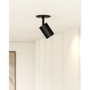 Cylindrical lamp head with recessed bulb socket. Circular attachment plate with vertical stem. Powder-coat finish. Adjustable directional light (90 Degrees).