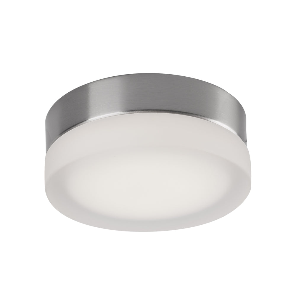 Single LED round flush mount ceiling fixture with three finishes. Round glass frosted and painted white interior with brushed nickel or black finish. Equipped with our powerful 120V AC LED technology.