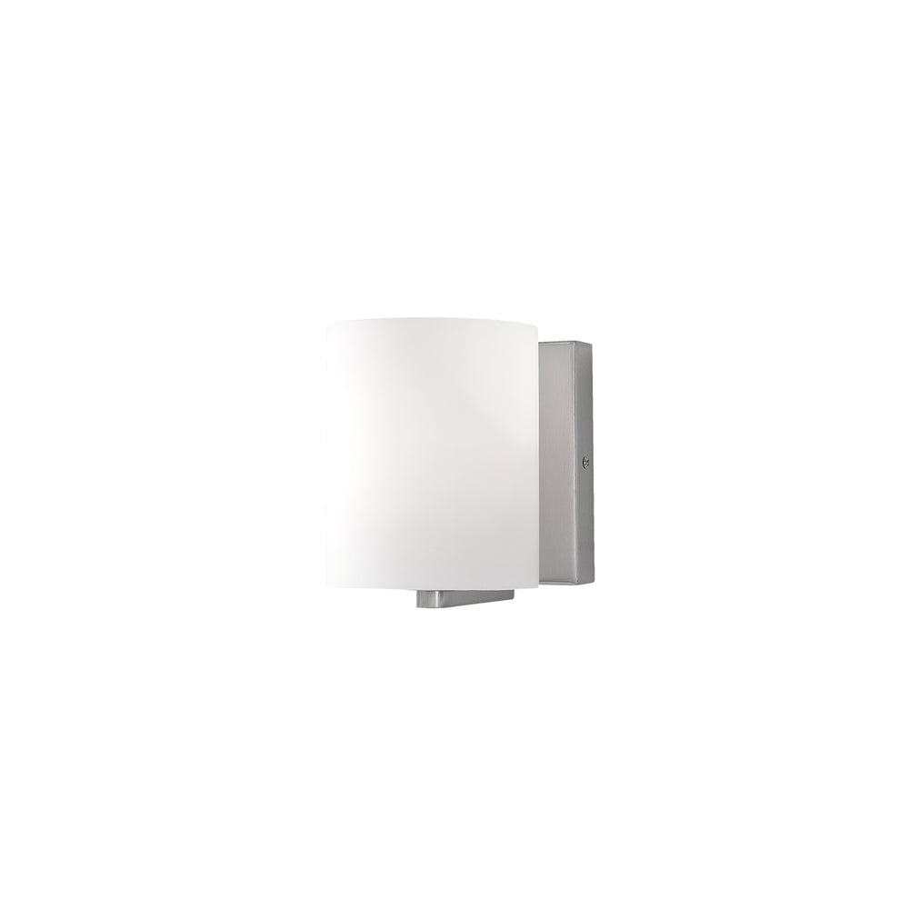 Single lamp vanity with white opal cylinder glass with your choice of brushed nickel or chrome metal details.